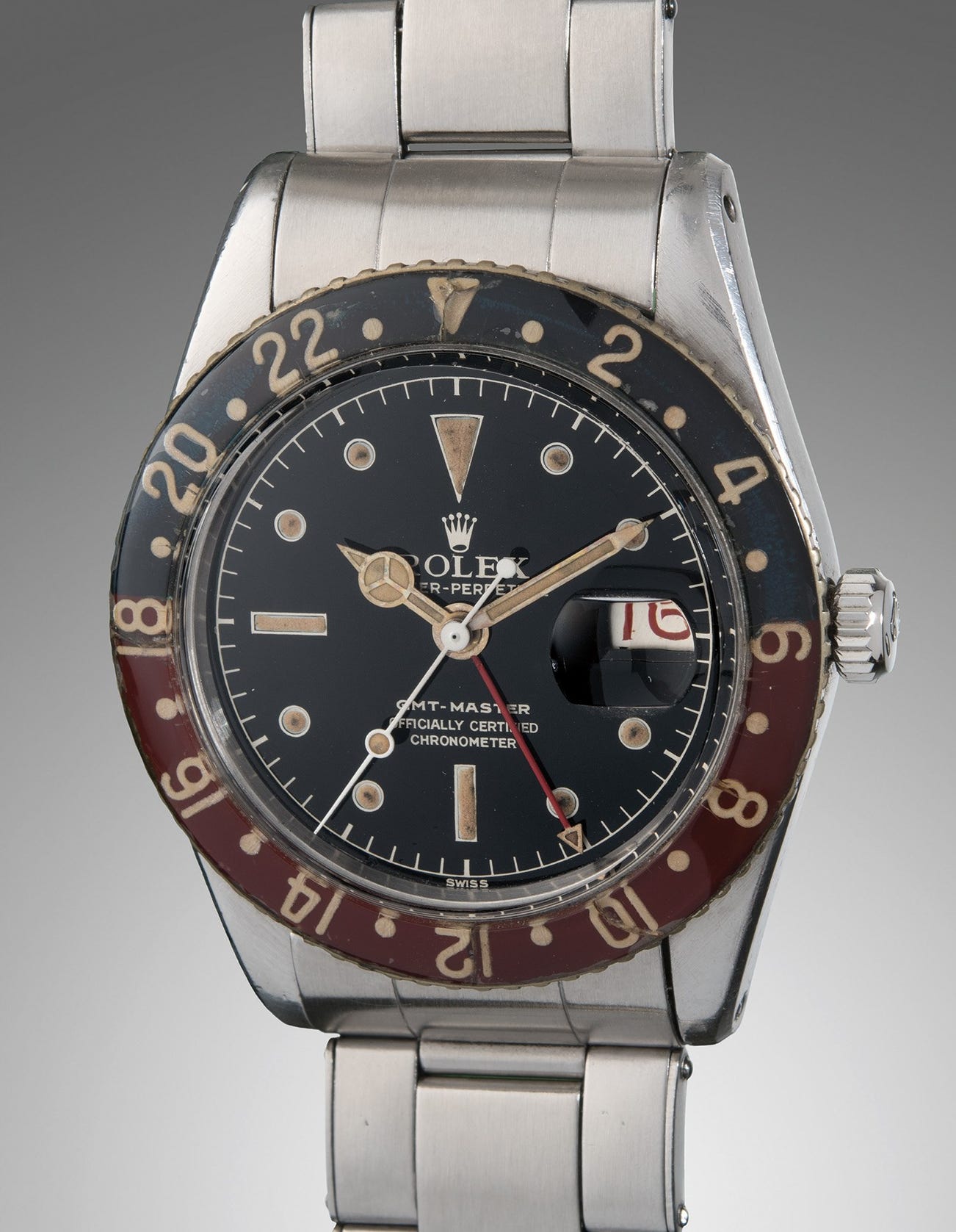 The present reference 6542, made circa 1958, is a lovely example of the model. It’s fitted with its original and still-glossy black lacquer dial with gilt lettering and luminous hour markers that have aged, along with the hands, to a warm brown hue. The case is beautiful, having never been polished, and retains its beautiful, crisp facets and original dimensions as delivered by the factory so many decades ago. The original luminous Bakelite bezel, so often missing or replaced on this reference, has aged gracefully over the last 60 years. Over the years, the GMT-Master has remained a perennial favorite amongst enthusiasts and the general public alike due to its practical functionality as a simple-to-use travel watch. It is a model that has a casual flair, which is suitable both in formal and informal settings, and complete, early examples like the present lot are wonderful watches that provide a window on to the innovative history of the brand and this iconic model’s origins.