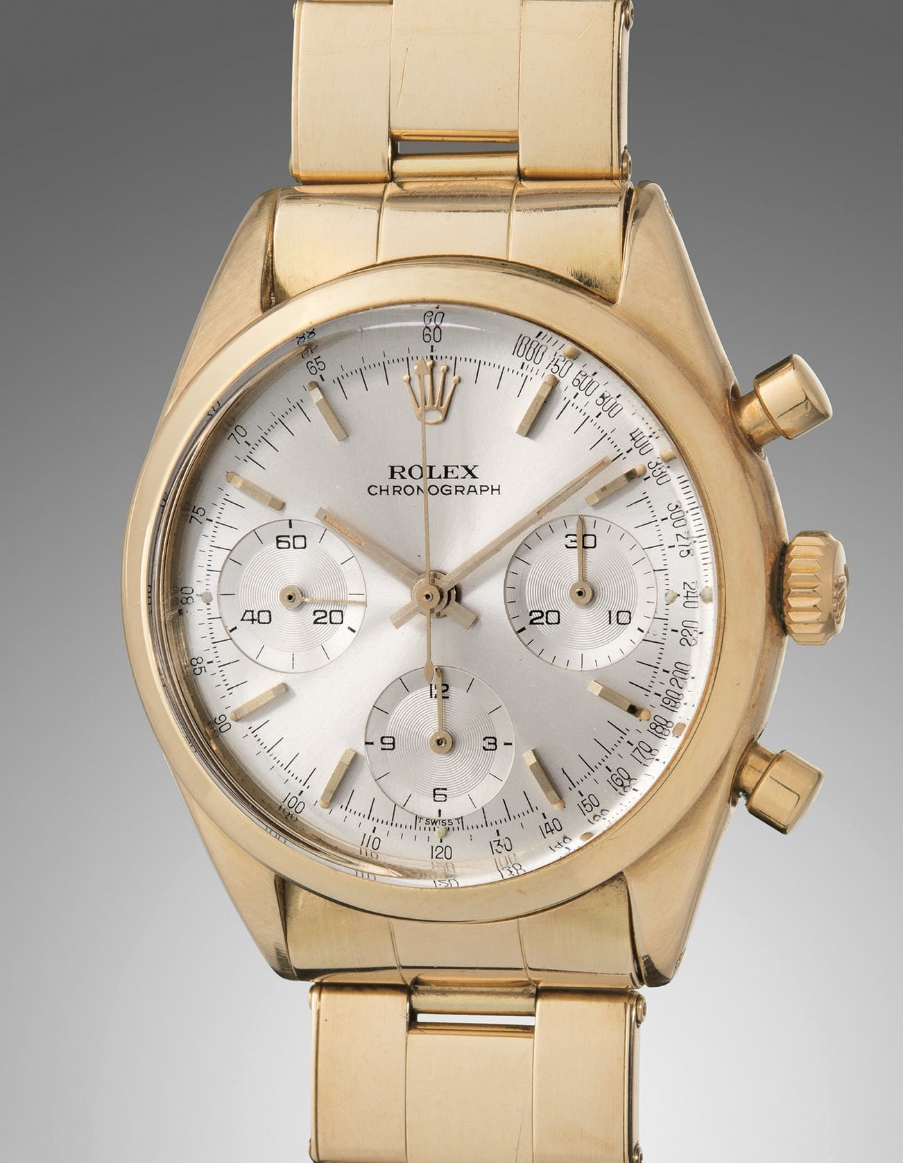 Rolex’s reference 6238 is recognized both for its rarity, attractiveness, and historical significance to the brand’s history as it was the last model to feature a tachymeter scale on the dial, before it was moved to the bezel as seen on all Daytona models made to the present day. The present watch is a superlative example, especially noteworthy for its 14 karat gold case and "ROW" export mark found on the movement, designating the watch’s export to the United States. The watch is in lovely original condition with thick lugs, a crisp smooth bezel, and completed with its original and rare 14 karat gold riveted Rolex Oyster bracelet. The silver dial radiates brilliantly with a brushed sunburst finish and luminous hour markers and hands that have aged to a pleasing light yellowish hue. The reference 6238 is a sporty and classic chronograph wristwatch that marked the end of an era, but also paved the way for a new age. It is a chic and easily wearable timepiece with great value for the enthusiast.