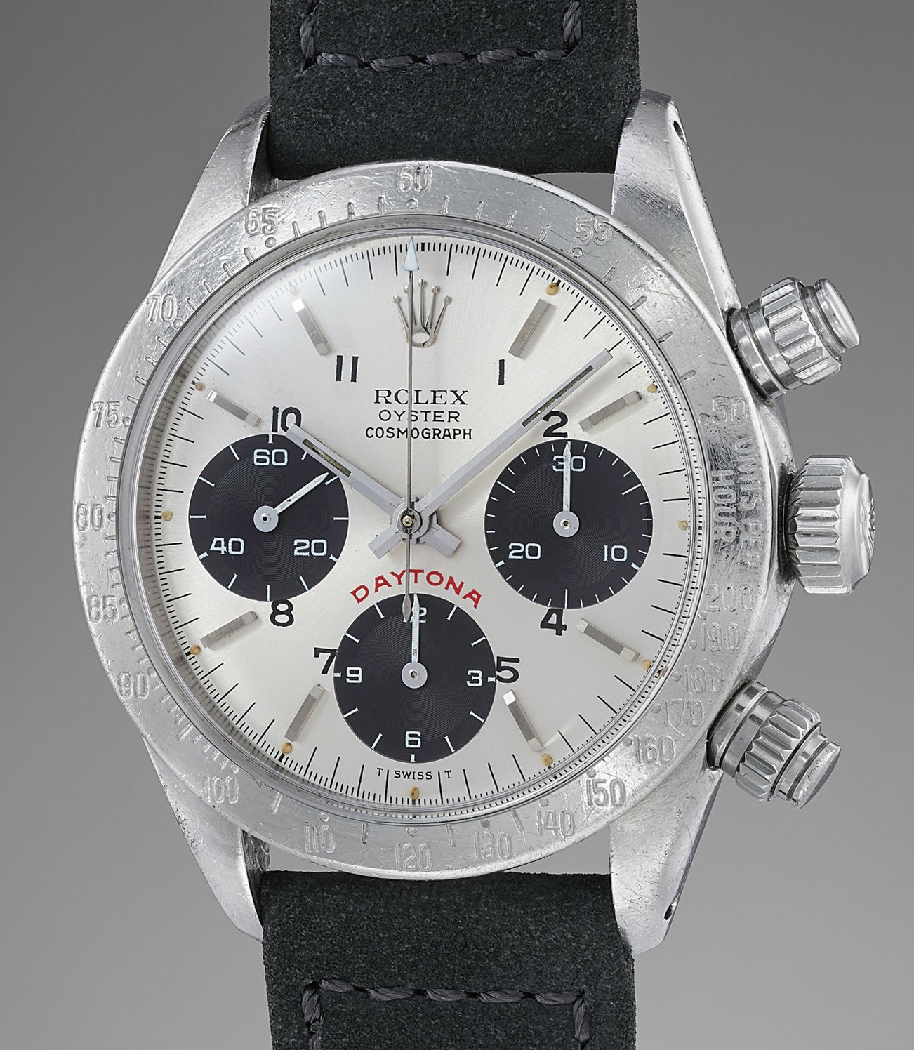 This extremely singular reference 6265 features a “Telephone” dial. In addition to having steel baton indexes and a “Big Red” designation, this watch also displays Arabic numerals printed directly onto the dial with black paint in the style of an old rotary telephone. It is our belief that for legibility purposes the owner of the watch had these numerals added at a later date giving the watch a rather unconventional yet interesting appearance.