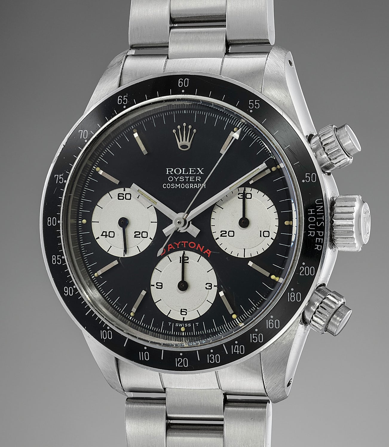 The present specimen is defined by its “Big Red” dial. The final evolution of the manual Daytona dial, it is found on the last specimen of reference 6263 (and its metal-bezel brethren 6265) and is characterized by a very prominent Daytona designation above the 6 o’ clock subsidiary dial in bright red ink.