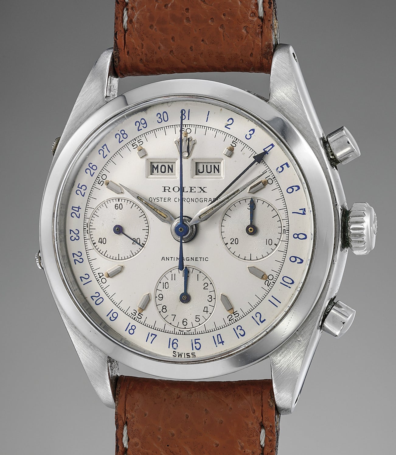 Its roots date back to 1947, when Rolex launched reference 4767 - Rolex's very first triple calendar chronograph wristwatch fitted inside a water-resistant Oyster case. Between 1947 and 1962, a total of four different Oyster Dato-Compax models were produced: references 4767, 5036, 6036 and 6236. Produced in yellow and pink gold as well as stainless steel, the production run was very small for each variation. Over the years, Rolex modified both the dial and case design, with the final watch in this series, the reference 6236, featuring a more modern, clean dial style, as well as a three-piece case with larger bezel.
