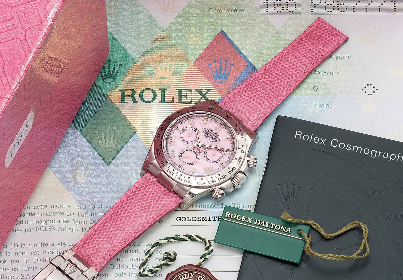 The two present blue and pink examples are a rare opportunity for the collector: they are offered complete of their sale kit, but especially they are in absolutely unused condition, the pink one even bearing its original factory stickers to the band. This timepiece is of incredible value for discerning collectors.