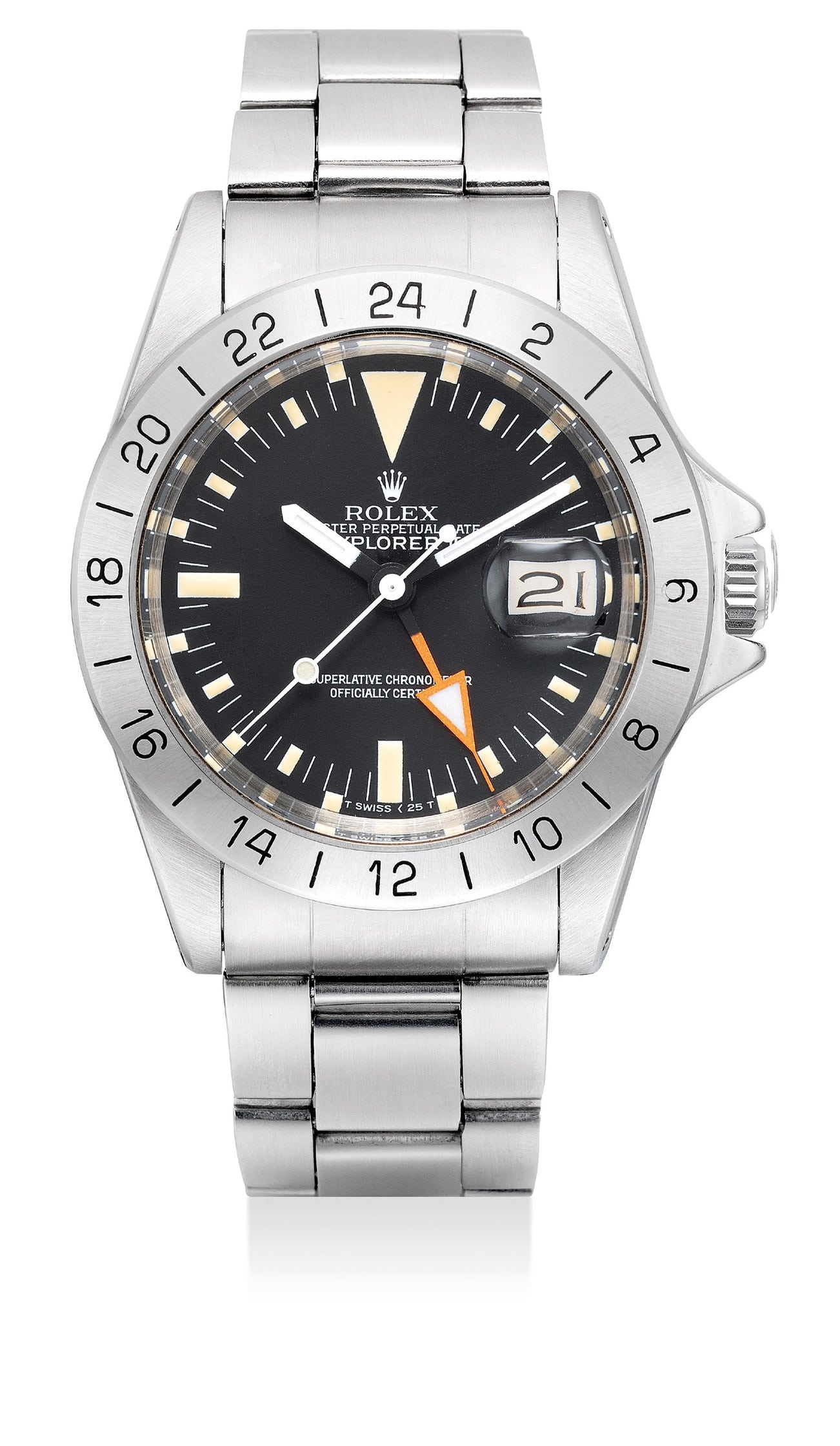 The ref. 1655 was produced in 5 different marks, and two additional service dials known, one with tritium and the other with luminova. The present example is fitted with a Mark IV dial and bezel and further accompanied by the full set of accessories that came with the watch when it was purchased.