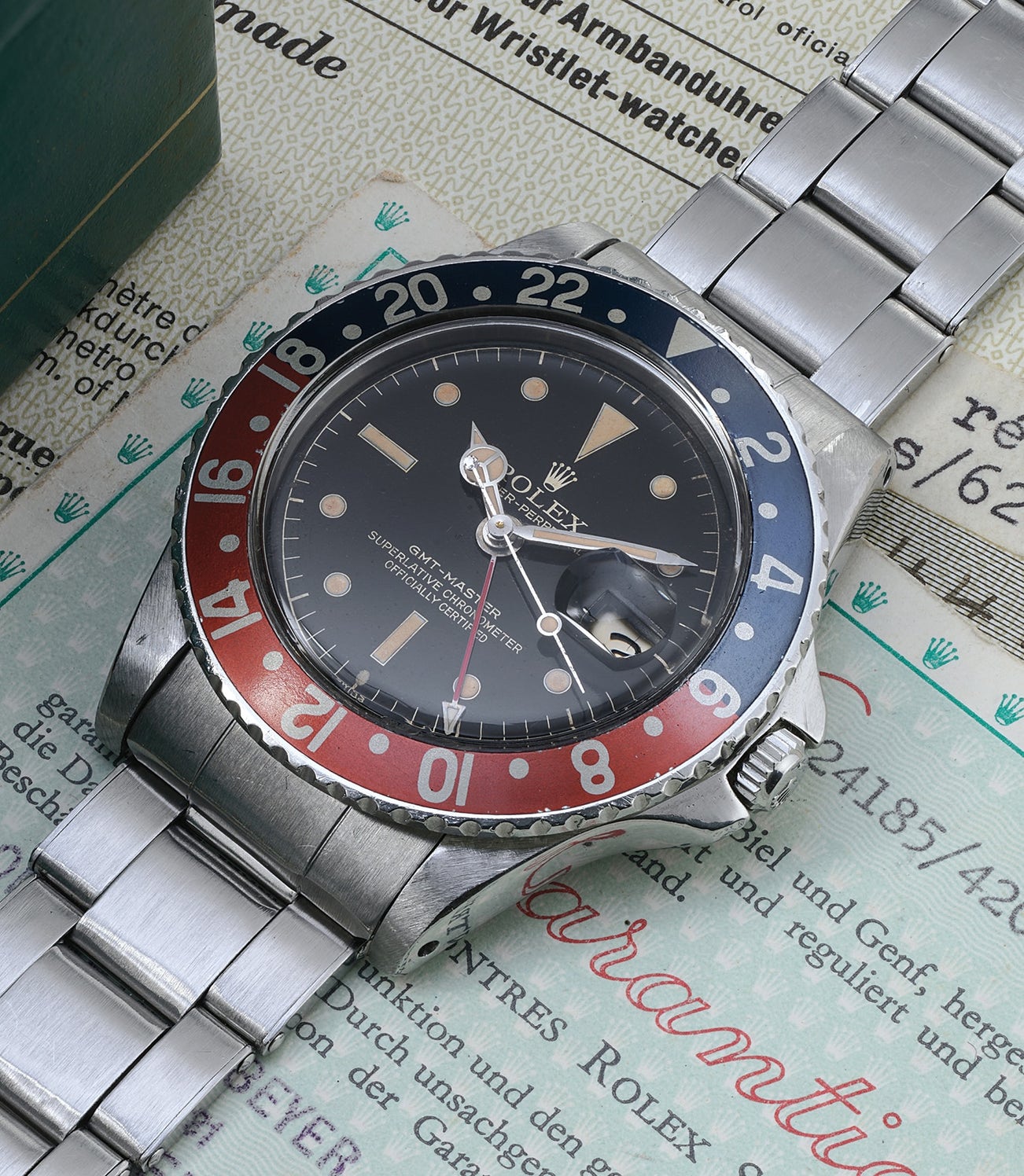 The red section of the bezel has faded to a dark orange tone, while the blue sector displays a vibrant blue color. The present watch is a truly fantastic example, complemented by the addition of its chronometer certificate, guarantee and fitted presentation box. Furthermore, the case is presented in excellent condition with crisp edges and sharp finishes.