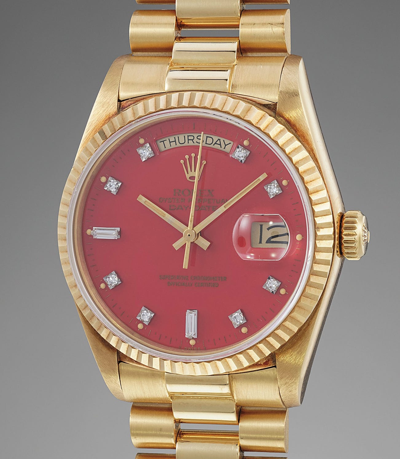 Named "Woman in Red", this timepiece is prominently illustrated in Day-Date, The Presidential Rolex by Pucci Papaleo. Dazzling and incredibly luxurious, it is preserved in excellent and most probably unpolished condition. The case displays an attractive layer of patina throughout and crisp hallmarks beneath the lugs. The bracelet is rigid and preserved in excellent condition. Furthermore, the "Stella" dial is intact and boasts a brilliant red sheen.