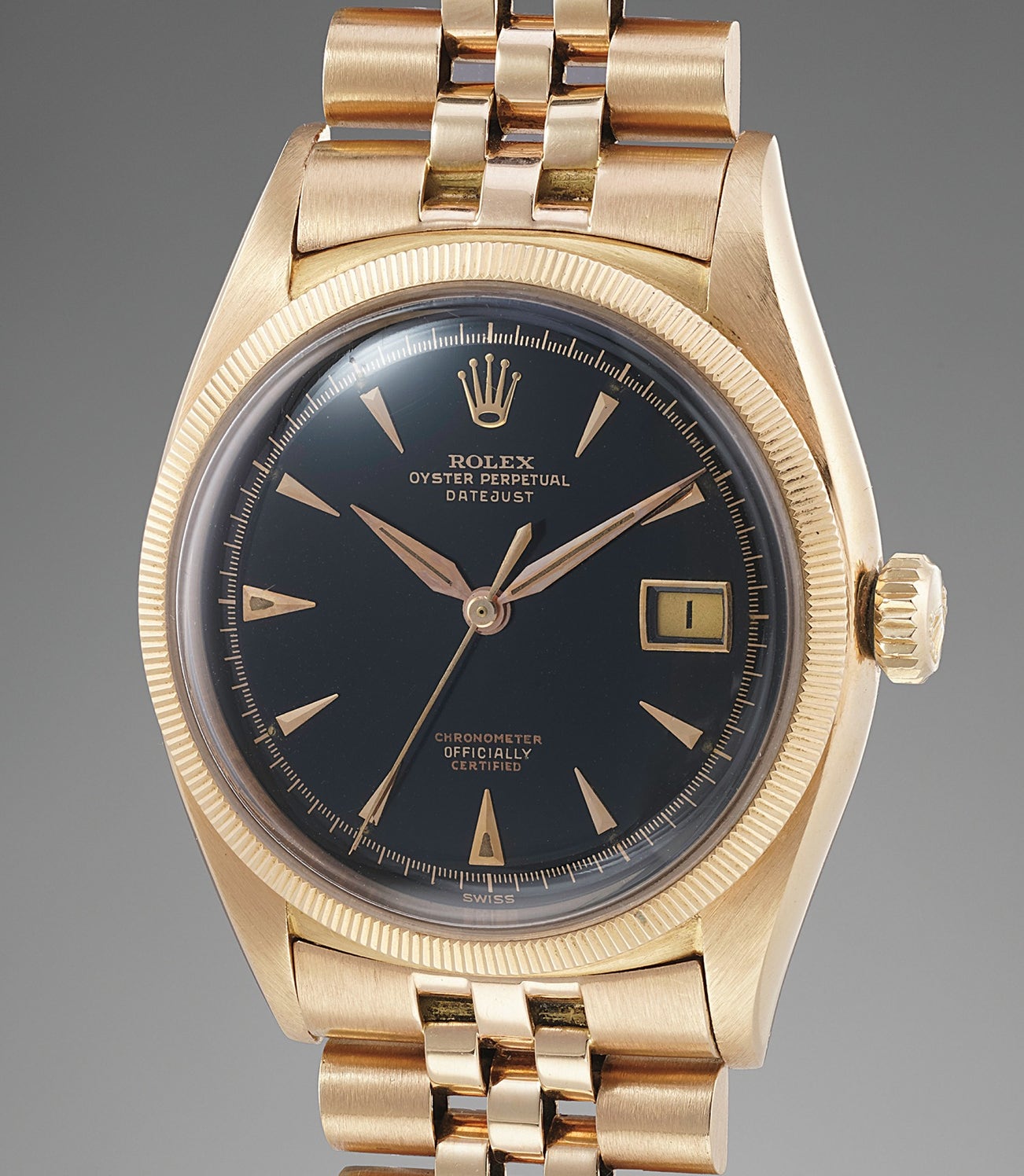 Preserved in sensational condition, this pink gold Datejust boasts sharp satin finishes on the top of the lugs, as well as a sharp hallmark beneath the lug. The case has developed a light layer of patina throughout, demonstrating how little intervention it has seen throughout its lifetime. This timepiece even retains its original Super Oyster crown. The pink gold Rolex Jubilee is stamped for the first quarter of 1954, corresponding to the year of manufacture.