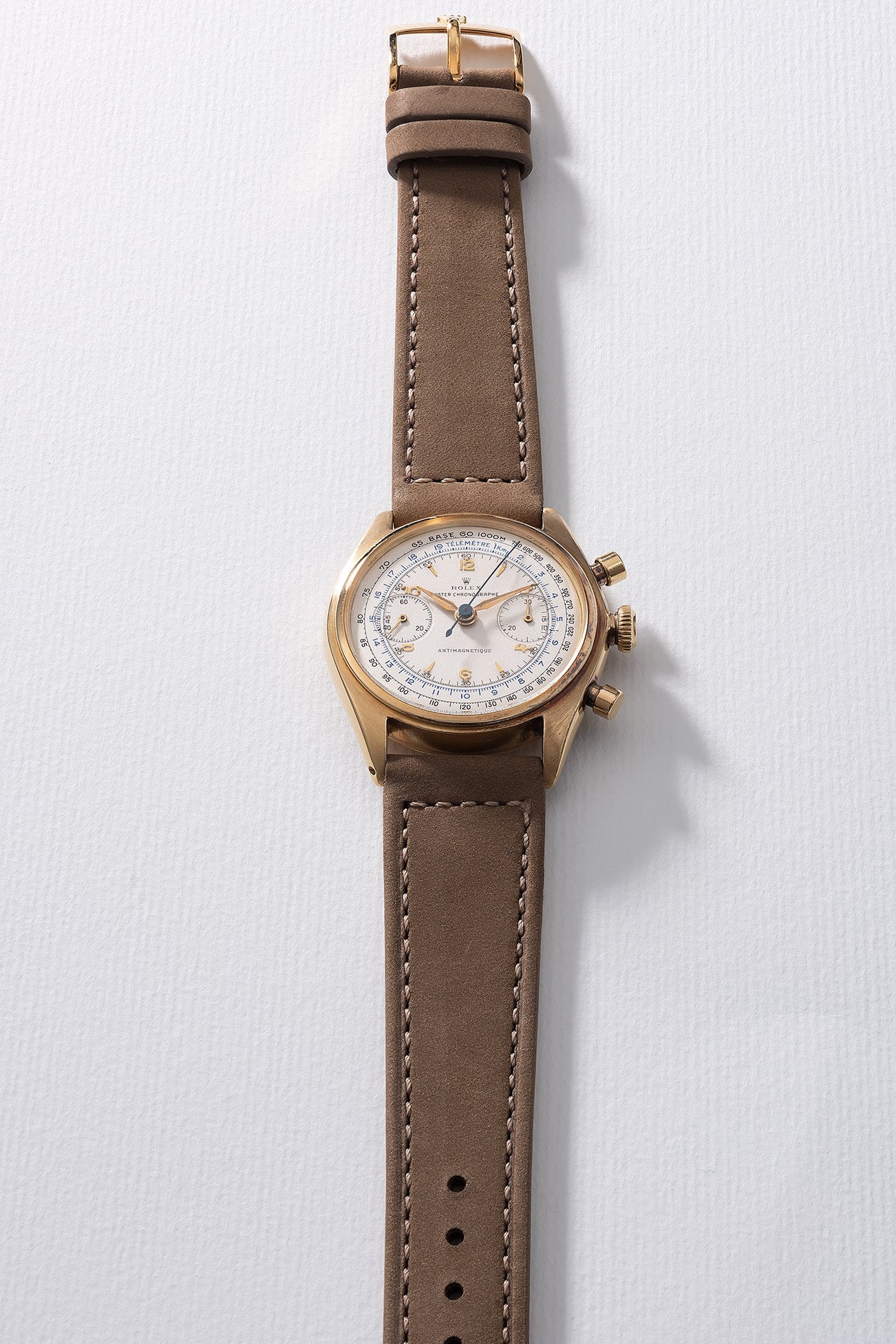 The launch of this reference 4500 chronograph introduced an all new case style with straighter, more pointed lugs that is until today, which can still be found on Rolex’s Oyster models today. The present ref. 4500 in 18K yellow gold is particularly a remarkable execution. The multi-scale dial features an eye-catching blue telemeter within the black tachometer scale found along its outer circumference. The case retains its well-defined lugs and original curves, boldly showcasing its original beauty.