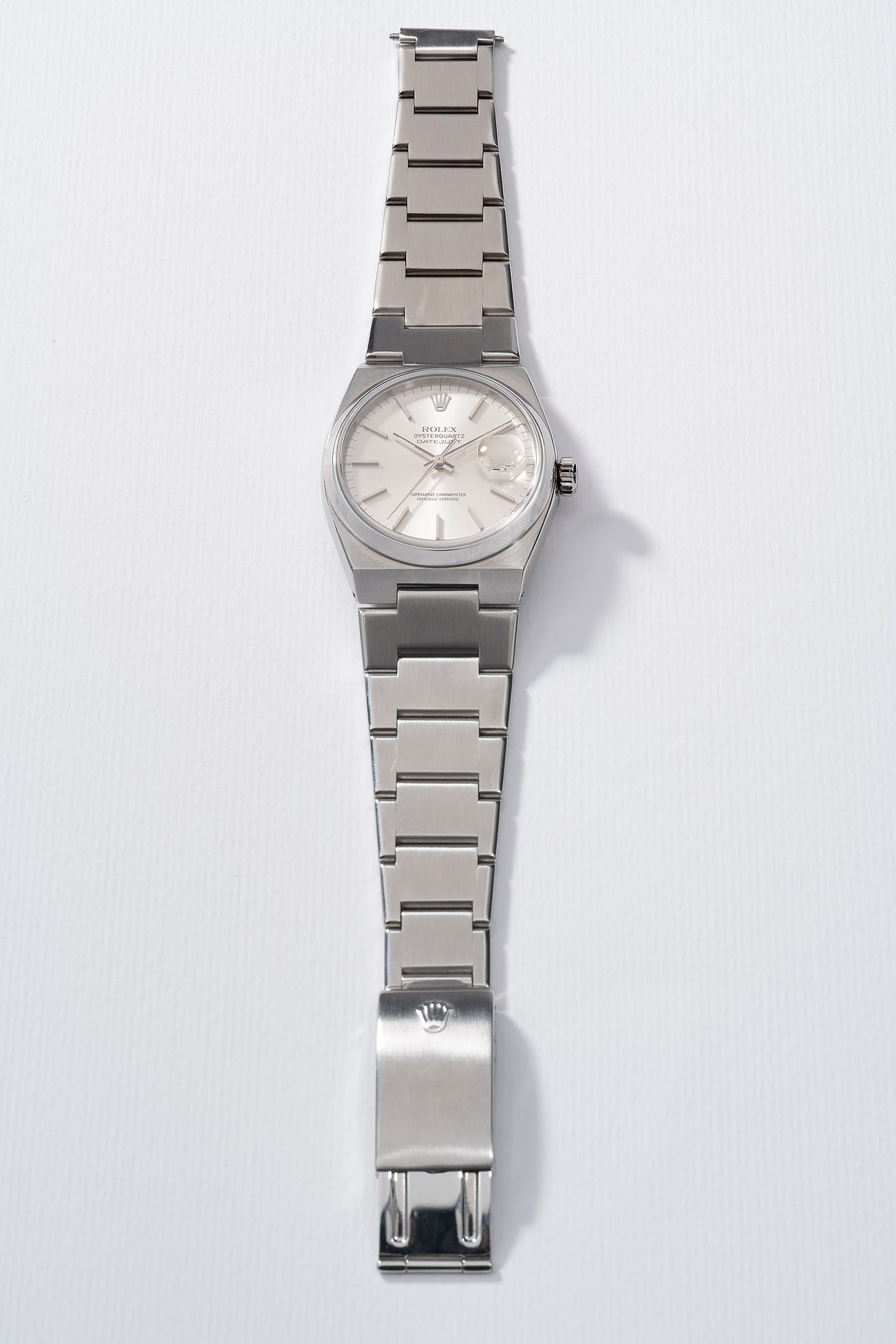 In very nice overall condition, the case of the present watch has full proportions and factory finish to the lugs and bracelet, with the dial retaining rounded intact luminous plots. Through the years, Rolex watches with quartz movement have become increasingly sought after, as watch collectors have become aware of the beauty and collectability of these timepieces, with the era of the Rolex quartz watch ending in 2001.