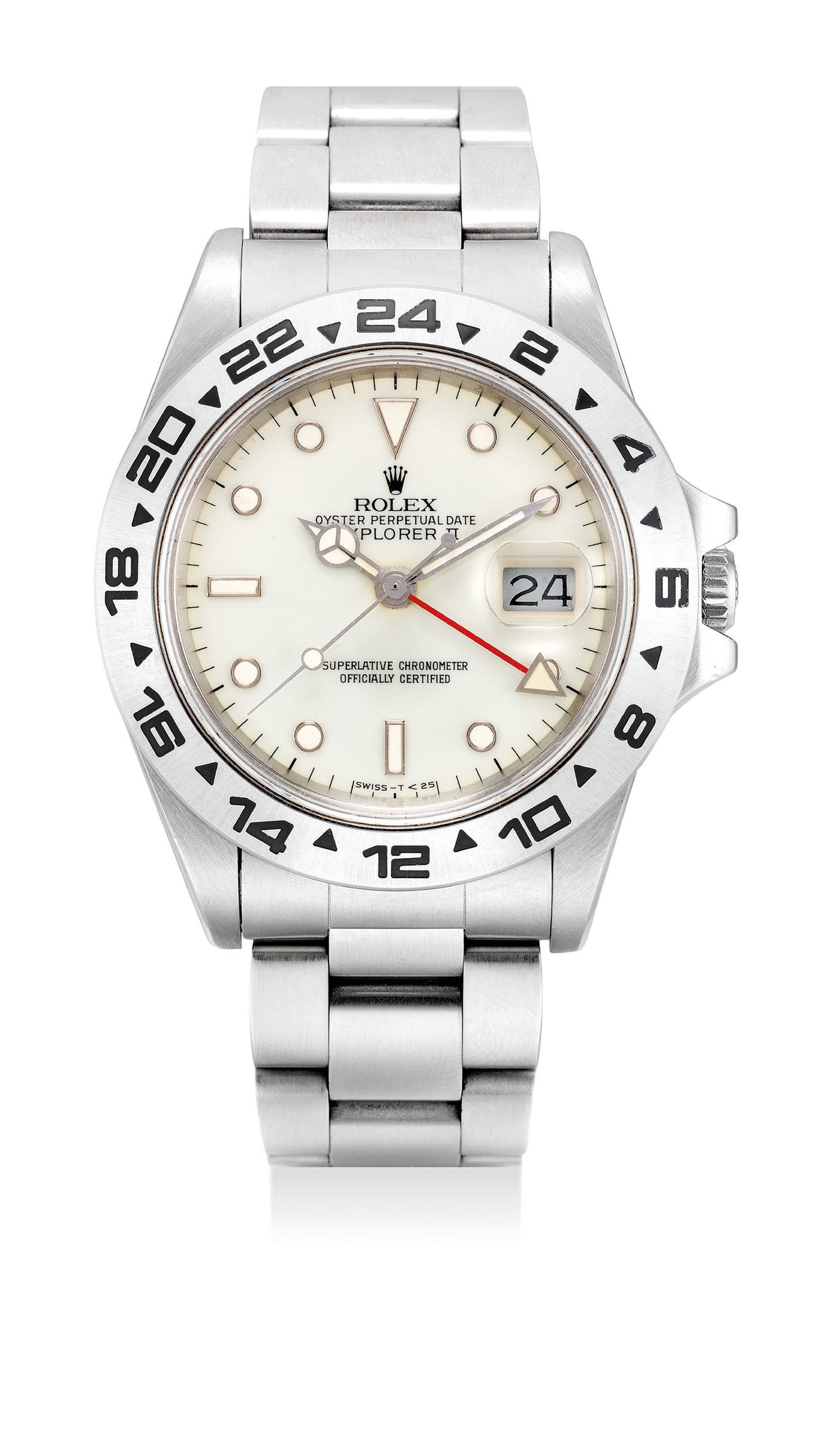 A fine and attractive stainless steel wristwatch with “ivory” rail dial, 24-Hour indicator, sweep center seconds, bracelet and presentation box.