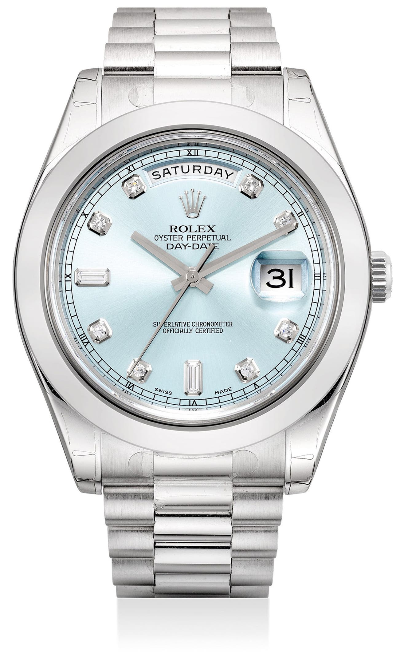 The present example is one of the last Day-Date II produced with a guarantee card stamped 2015. Housed inside a beautiful and weighted platinum case is the reliable and robust cal. 3156 under a splendid ice blue dial with diamond indexes. Presented in new old stock condition and further accompanied by the original guarantee and box, this present example is a fantastic opportunity to acquire an attractive and luxurious wristwatch manufactured by none other than Rolex.