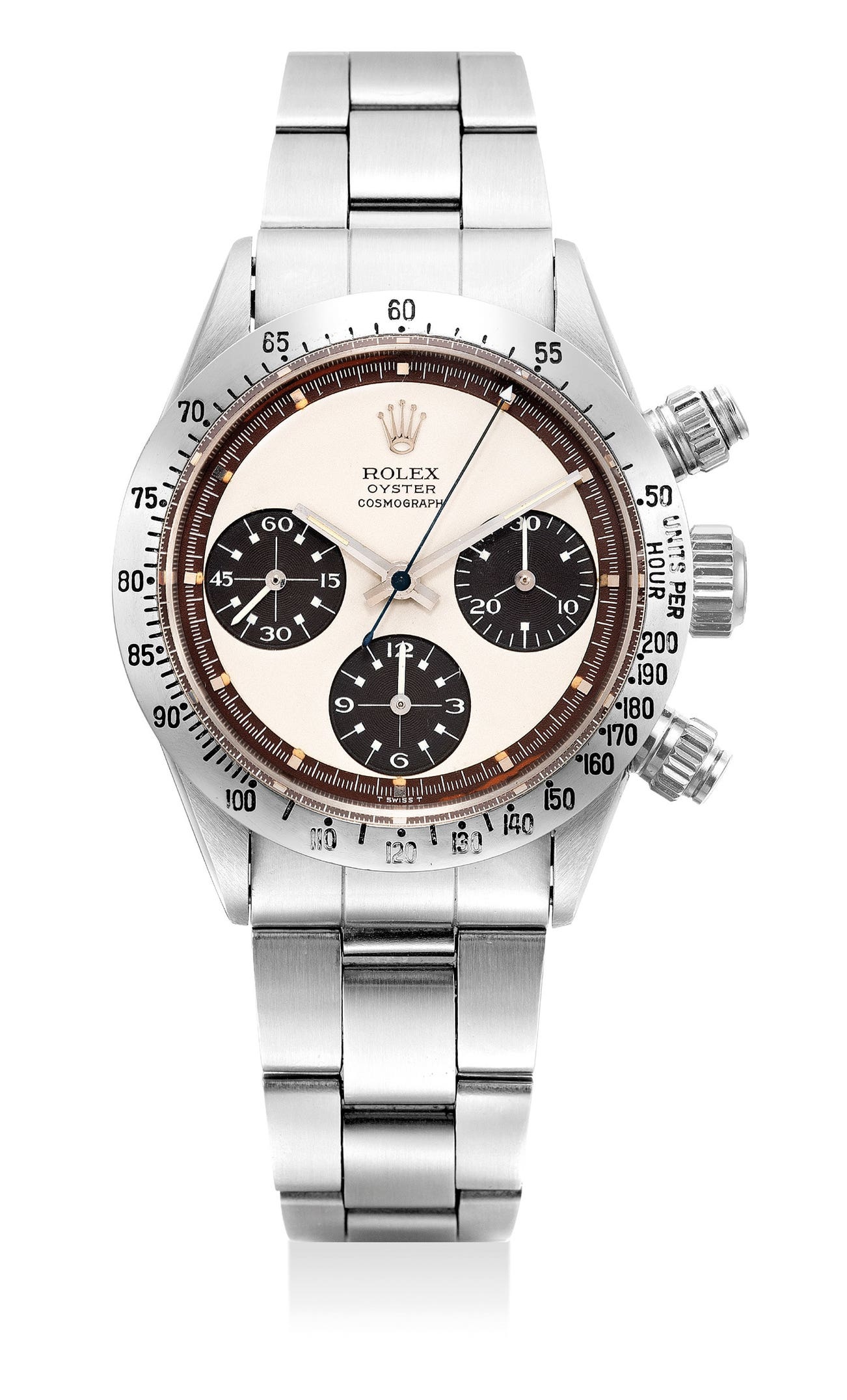 An extremely rare, attractive and well-preserved stainless steel chronograph wristwatch with “Paul Newman” dial, “tropical” outer minute track and bracelet