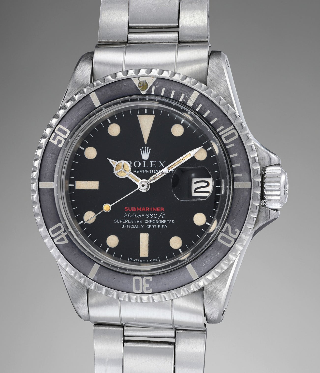 Launched around 1967, reference 1680 was the first Submariner model to be fitted with a date function. Early examples displayed a ‘meters first’ depth rating, with the ‘Submariner’ script printed in red, hence the name "Red Submariner". Most notably, early examples such as this one were given a red “Submariner” designation on the dial, while later examples feature white graphics. Adding rarity and flair, Red Submariners (as opposed to their Sea-Dweller counterparts the “Double Red”) are today extremely sought-after. Even within the Red Submariner family of dials, one can notice an evolution of the graphics with 6 variations (Marks). The present early specimen features a Mark II dial, recognizable from the meter first arrangement of the depth rating, a feature shared by Mark I to Mark III dials. Mark II dials are furthermore defined by the very thin font used for the depth rating as well as an "open" 6. Mark II (and also Mark III) dials can be found on examples from about 2.15M serial to 2.45M and it is estimated that less than 5% of the total 1680 made feature this dial.