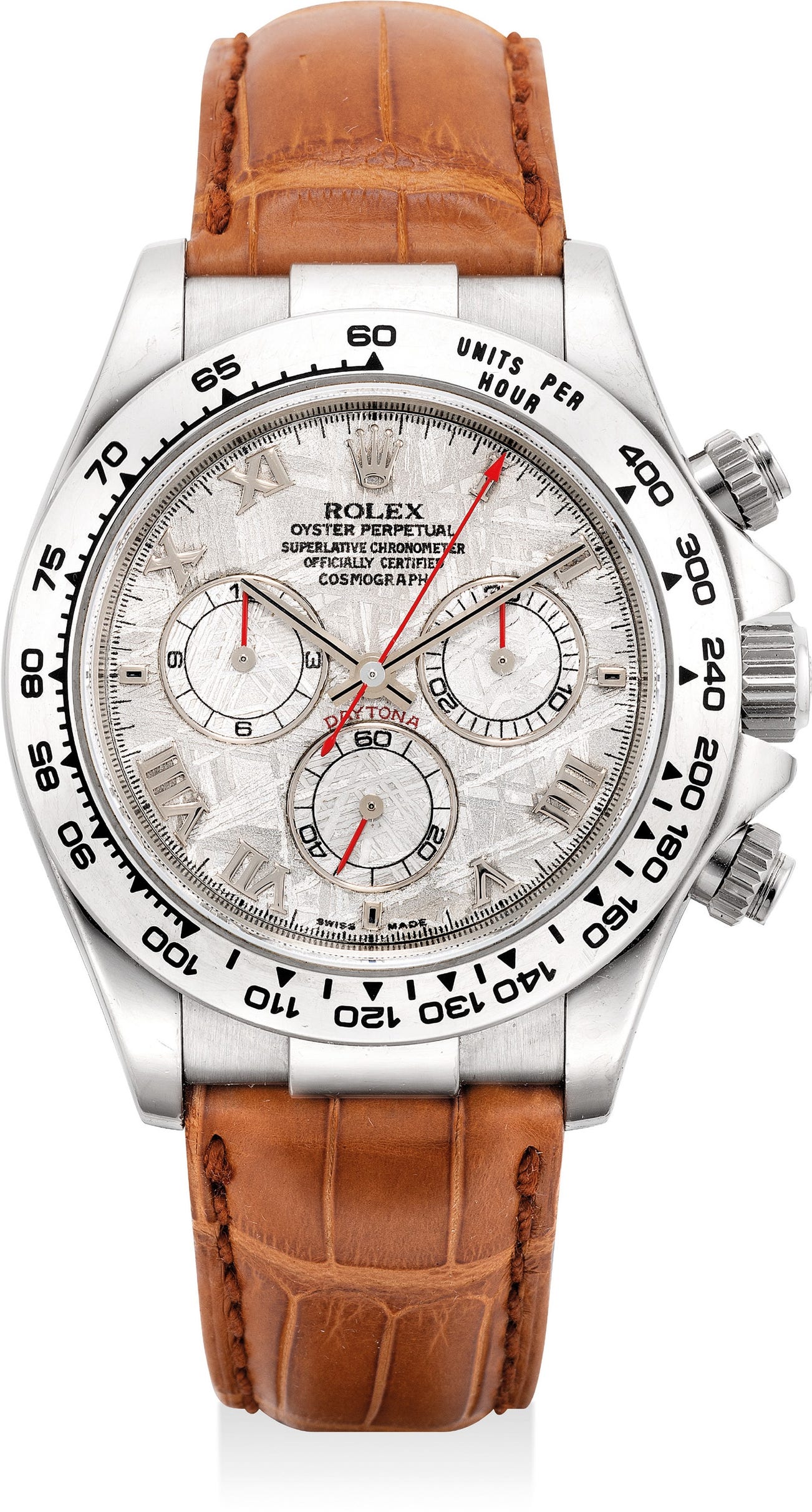 The present example of a Rolex Cosmograph Daytona ref. 116519 encased in white gold is a rare example fitted with a meteorite dial.