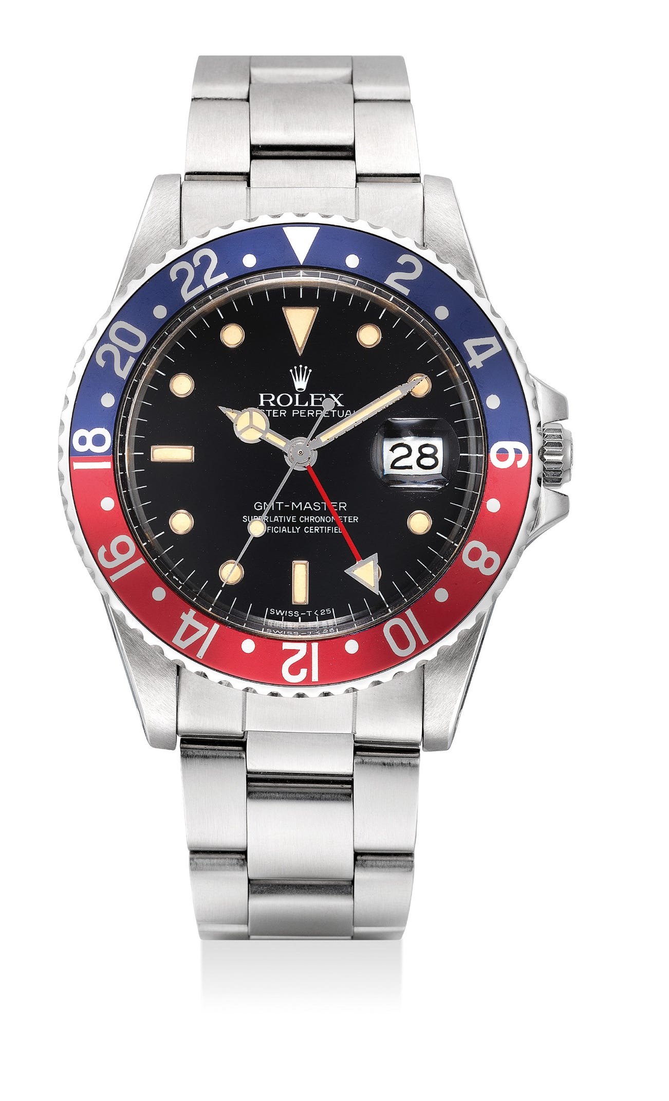 The present piece is a transitional Rolex GMT-Master reference 16750 first launched in 1980. With an upgraded feature of a quick-set date, the GMT-Master proved a lot more practical. Fitted with a glossy black dial and later examples with the luminous material filled in a metal border, instead of the traditional method of implementing it directly on the dial. Presented in excellent overall condition and with the luminous material having aged to a beautiful buttery yellow hue, the present example is attractive.