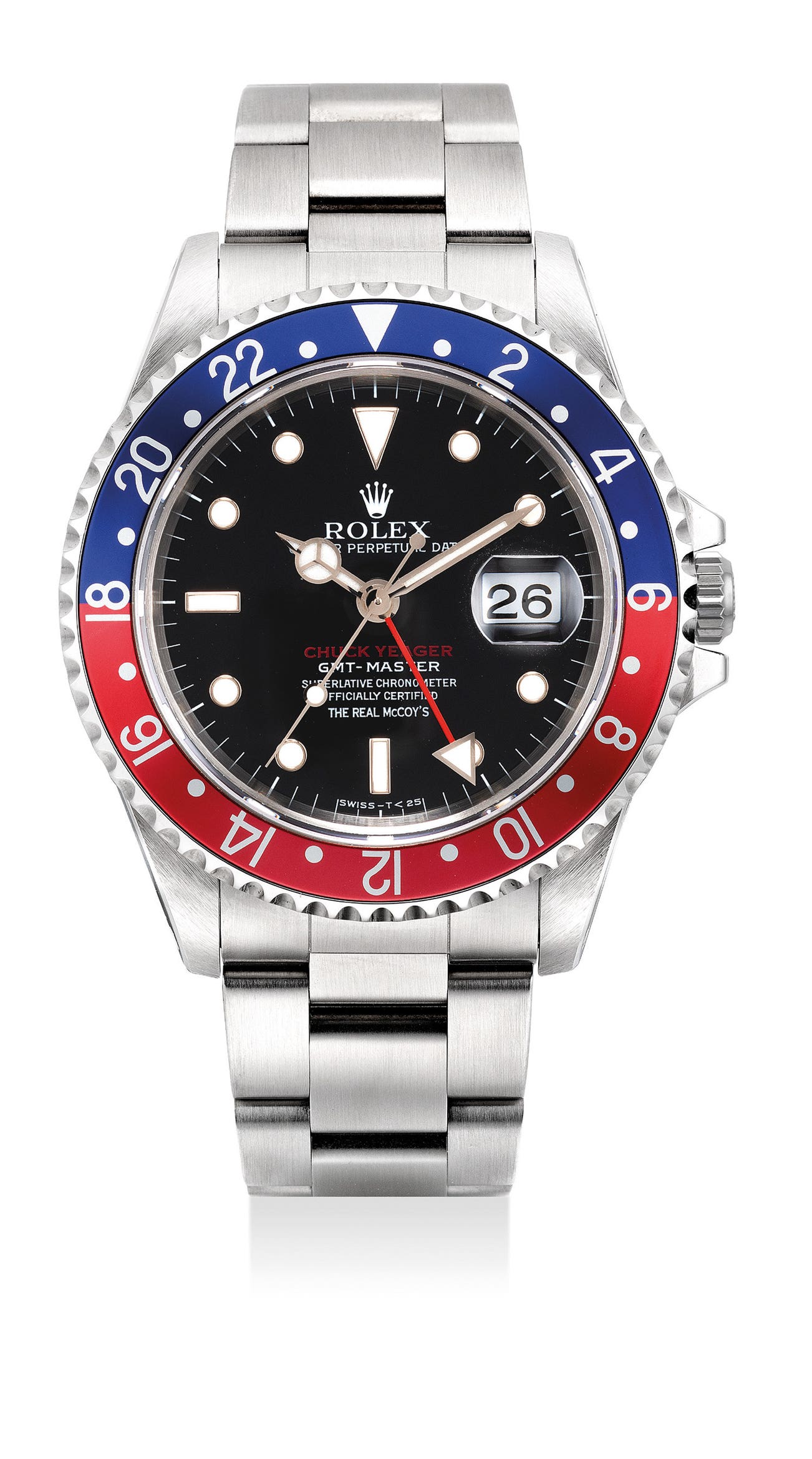 The present reference 16700 GMT-Master is a 1997 limited edition made of 50 examples by the Japanese firm, The Real McCoy’s in honor of the 40th anniversary of Yeager’s outstanding feat. The model 16700 was released in the late 1980s and featured a sapphire crystal and white gold chaton’s for the numerals. The customized Real McCoy’s examples sport a dial with a red “Chuck Yeager”, and the case back has been engraved “General Chuck E. Yeager Bell X-1 October 14, 1947 18/50 The Real McCoy’s”. In exceptional original condition with sharp lines and crisp engraving, this example is accompanied by its original guarantee and presentation box. The Rolex GMT-Master is an icon in the watch world, and it is note worth for this example to recognize a legend within the aeronautic world.