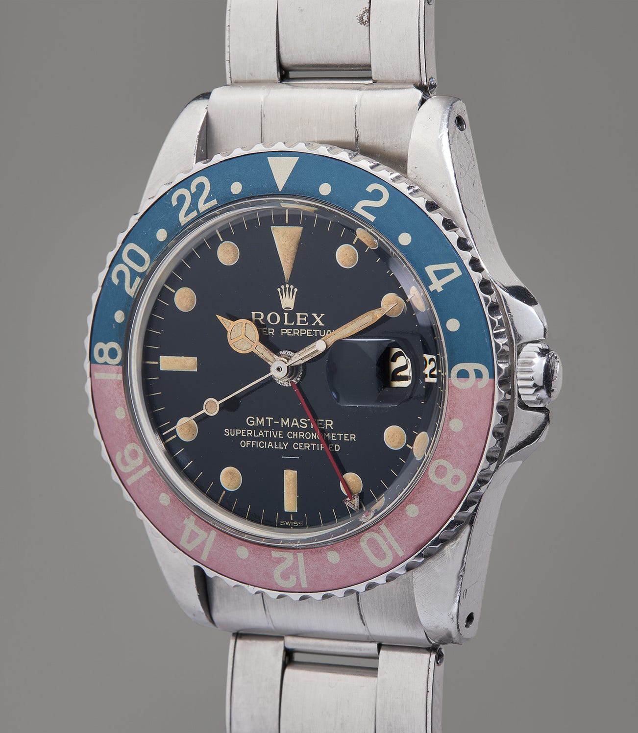 In wonderful overall condition, the case retains its original bevels and contours as delivered by the factory, having in our opinion, never been polished. The dial is a gorgeous example with a beautiful black glossy finish, and perfectly intact lume plots. The hour and minute hands are original gilt with lume matching in color to the dial, and the GMT hand has the correct small arrowhead at its tip.