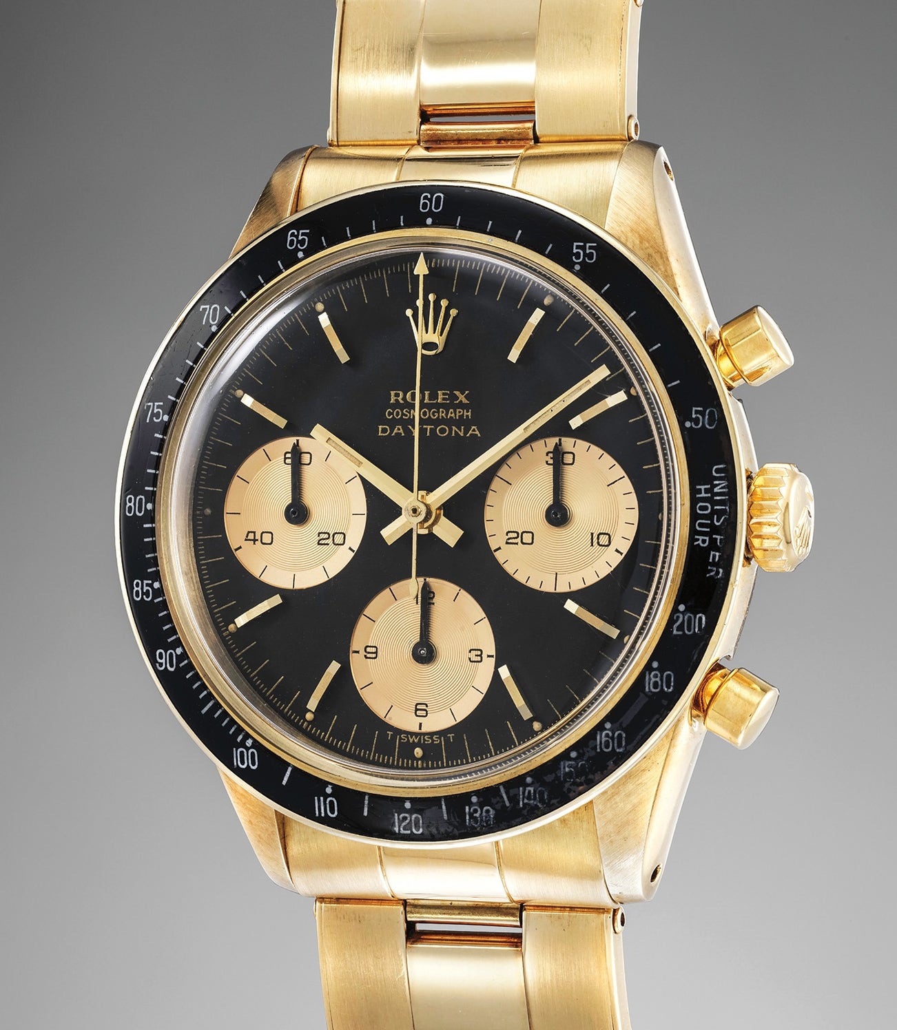 Created as a tool watch for professional drivers, the main requisites of the Daytona were durability, accuracy and readability. This is why - especially in its early days - the watch was cased predominantly in stainless steel. A gold case, with its hefty weight and tender material, goes completely against the elected professional destination of the piece. With time, the Daytona became more of a status symbol piece than an actual tool watch, but in the 1960s this was still to happen. As a consequence, gold 6241 models are extremely rare. In this case, however, rarity jumps to an even higher tier, as the case is in 14K gold, rather than the more commonly seen 18K. It is speculated the 14K cases were made to limit the tax impact of importing 18K gold products in some countries.