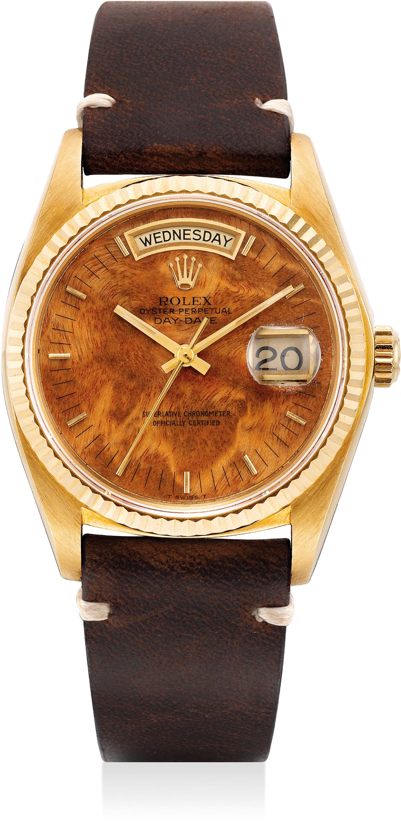 An attractive and rare yellow gold wristwatch with sweep center seconds, day, date and “wood” dial