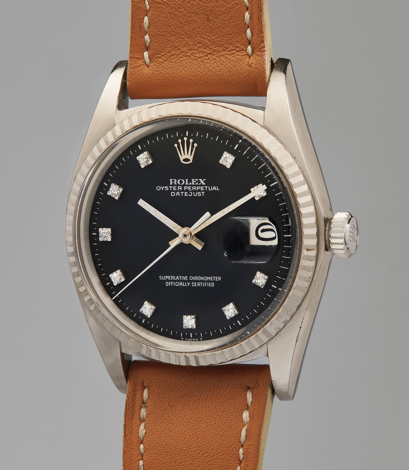 Preserved in excellent overall condition with a crisp and unpolished case, this rarely seen 18K white gold DateJust is an exceptional and highly sought after example due to its rarely-seen black dial with non-luminous hands and diamond-set hour markers. The DateJust has evolved over the last 75 years into an iconic timepiece that is both functional and sophisticated.