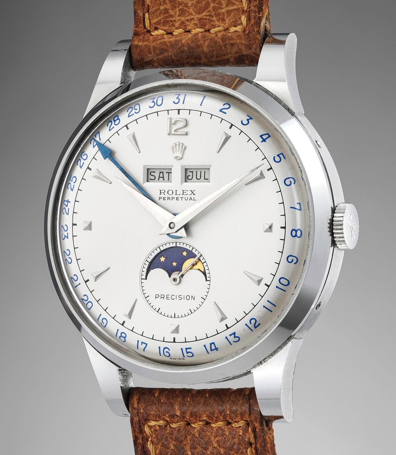 Known to the market for over nearly thirty years, this reference 8171 comes up in conversation amongst cognoscenti, dealers and collectors alike, when asked to identify one of the most impressive Padellones in existence. Simply put, it represents the benchmark in terms of condition, factory finish and aesthetics when it comes to the steel version of this iconic triple calendar model. Throughout the last thirty years, it has been in three of the world's greatest private watch collections and on each occasion when offered at auction, it is has been welcomed with enthusiasm by the collecting community and set benchmark prices for this reference. It was also, amongst the dozens of submissions and proposals, chosen by John Goldberger when picking the final selection for his standard-setting book 100 Superlative Rolex Watches.