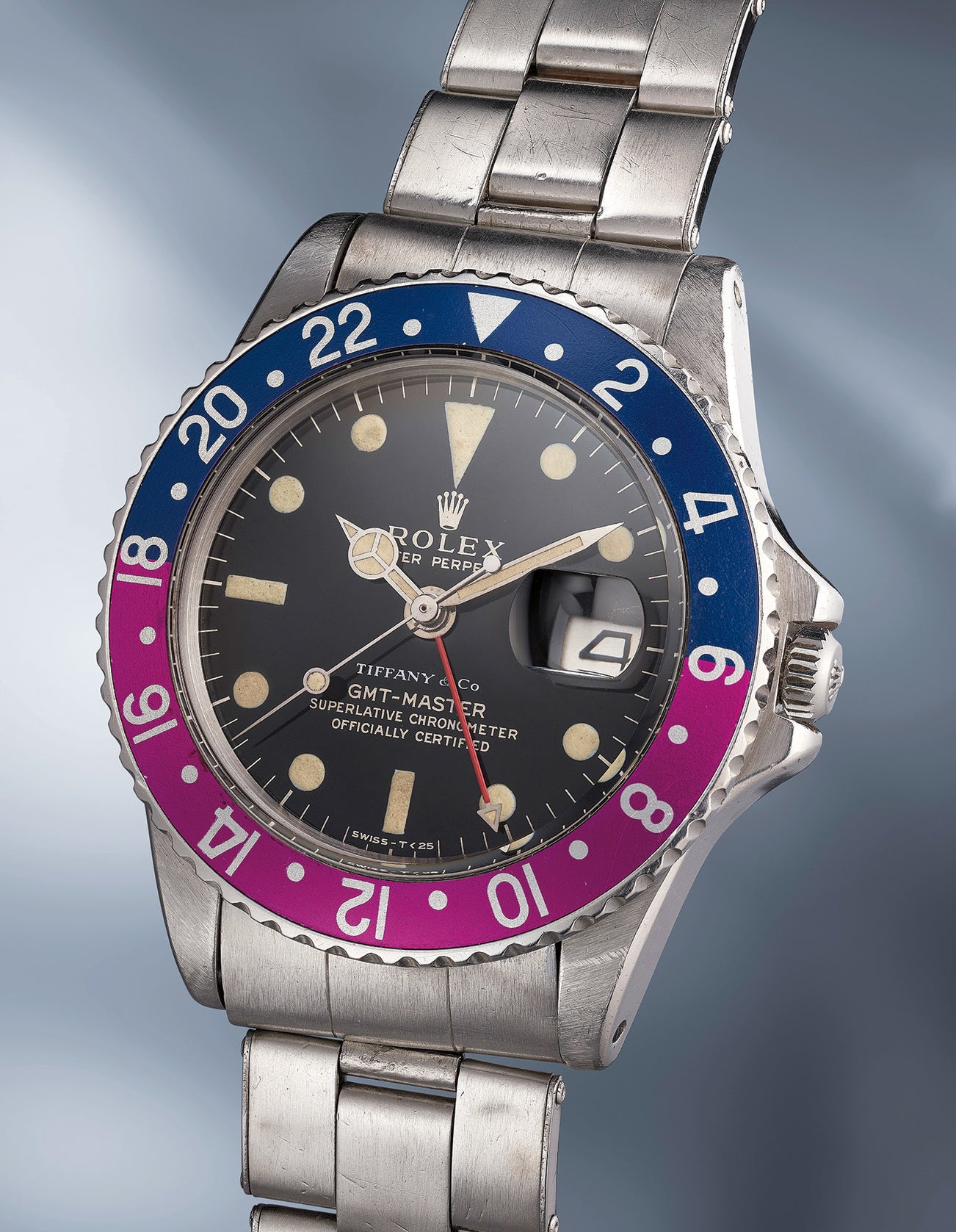 Of course, the presence of the Tiffany & Co. signature propels the watch to a whole new level of collectability compared to its non-signed brethren, especially considered the fantastic fuchsia insert: the red half of it has faded to this eclectic violet hue in a virtually perfect manner: absolutely even. Most notably, the movement is stamped ROW indicating export to the American market - fitting, considering the signature on the dial. Furthermore, the blue side of the ring remained intense and vibrant, a highly uncommon occurrence which adds to the aesthetic and technical charm of this superb timepiece.