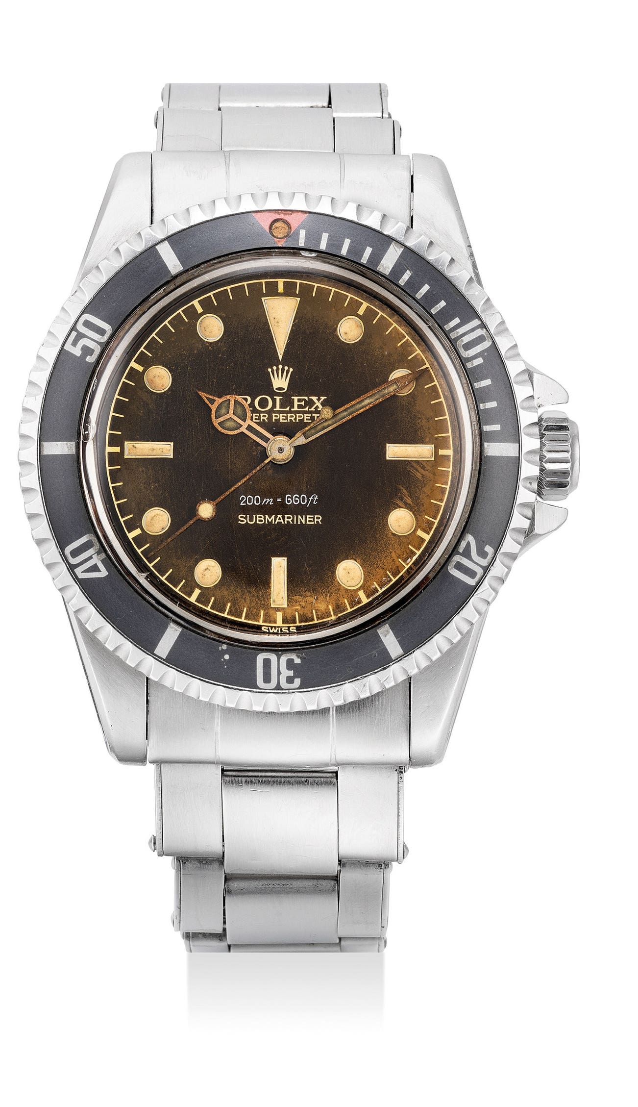 The present specimen is an extraordinary and very well-preserved Rolex Submariner ref. 5512 “tropical” 2-liner 'Eagle-beak' crown guard. The dial has been preserved in immaculate condition with a highly attractive “tobacco-like” tropicalization that transcends a unique identity for this particular example. Furthermore, featuring a 478’XXX serial, it is one of the earliest examples of the reference from 1959 and its rarity is further exemplified by the presence of the “red” triangle on the bezel insert. This is with no argument a true piece of horological artistry that depicts the history and transition of one of the most renowned wristwatches ever produced.