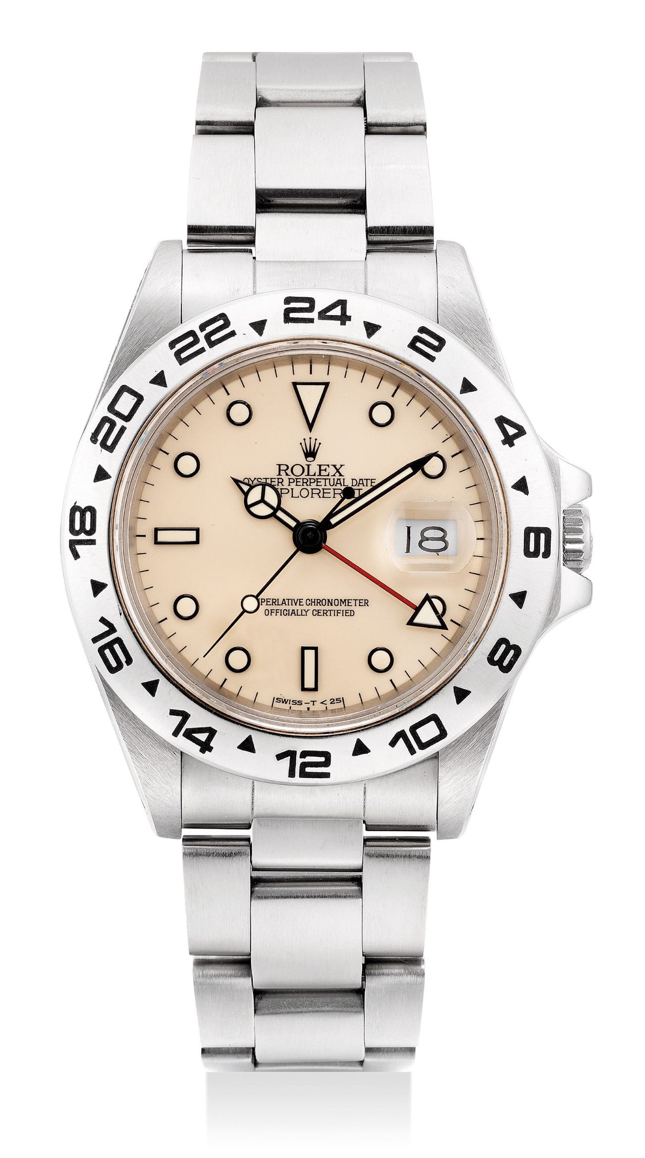 A fine and rare stainless steel wristwatch with sweep center seconds, date, 24-Hour indication, “cream’ dial, bracelet, guarantee and presentation box