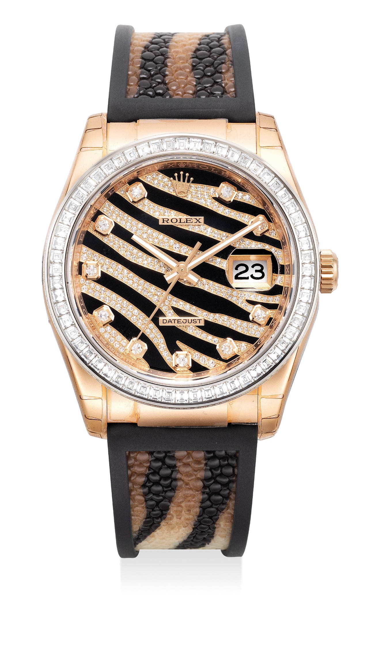 The present example is an extremely well preserved new old stock of a Rolex Date-Just ref. 116185-BBR. With an extravagant appeal, the present watch is fitted with a baguette and brilliant diamond-set bezel with a pave diamond-set dial with glossy black lacquer accents that mimic the hide of an exotic Zebra. Furthermore, the original Rolex rubber and sting-ray strap exceedingly adds an elevated level of lavishness on the present piece.