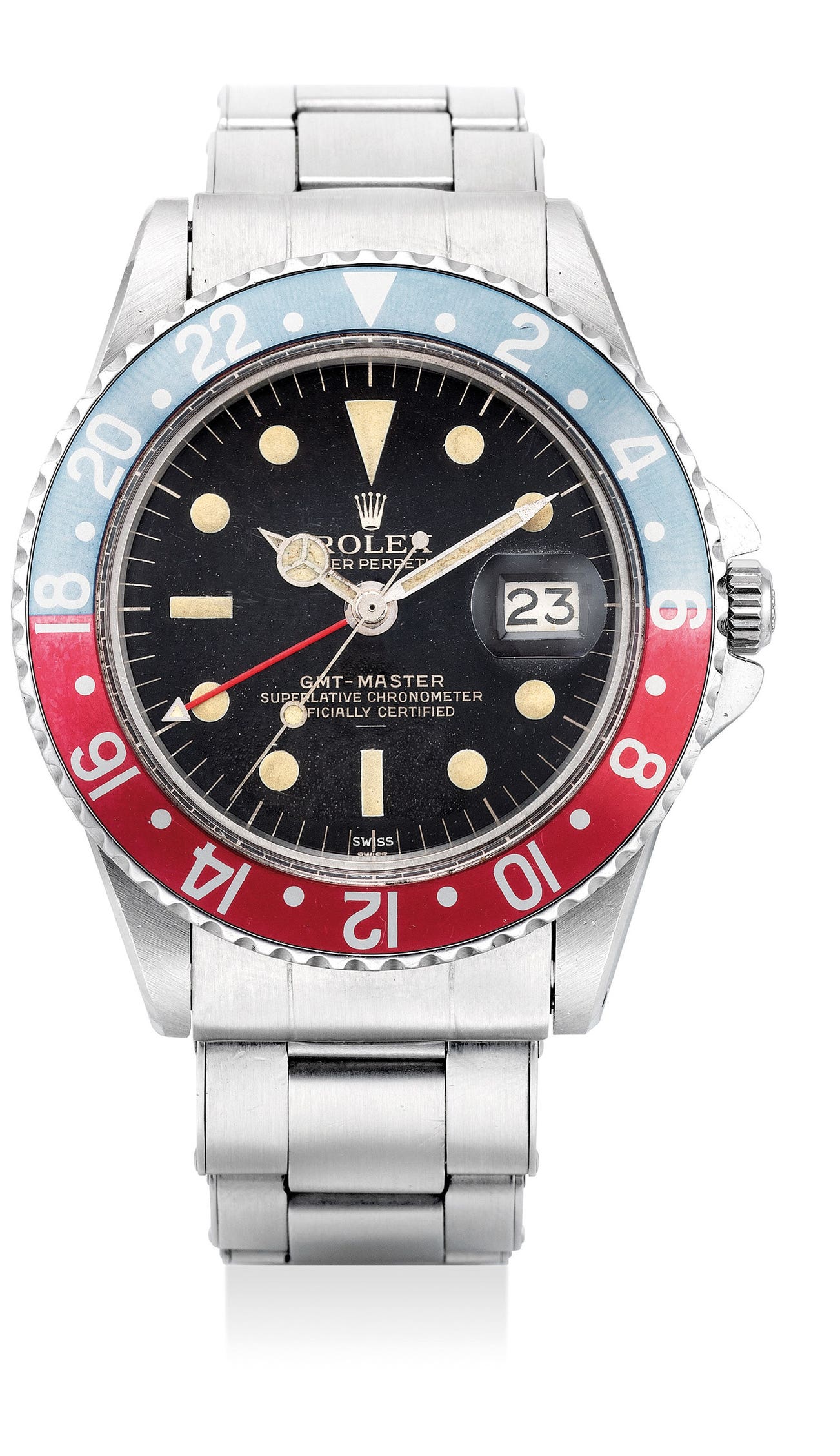The present example of a Rolex GMT-Master ref. 1675 with gilt underline “double Swiss” dial with an 876’836 serial corresponds to the dial configuration of the present watch. Furthermore, it features luminous plots with a lower Geiger reading than examples of Rolex wristwatches from the 1950’s which is correct for this present transitional model. Offered in excellent overall condition with a beautiful case and a nicely preserved dial, it is a very rare treat for passionate connoisseurs of vintage Rolex to acquire a wonderfully rare example of the famed reference.