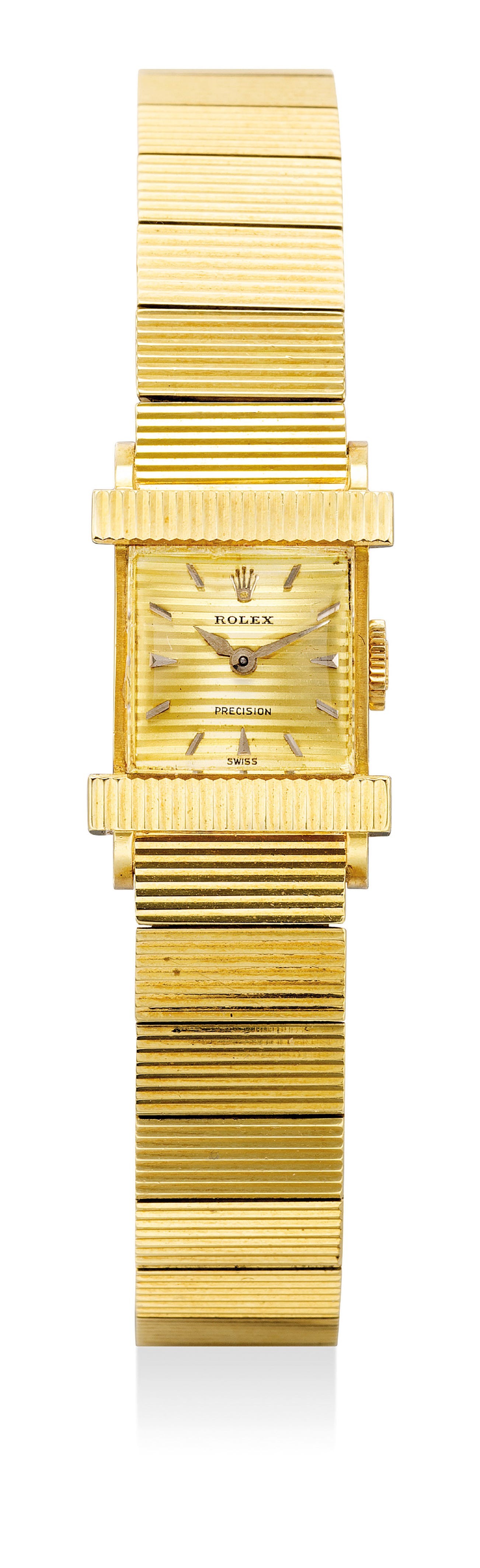 A lady’s fine yellow gold rectangular-shaped wristwatch with integrated bracelet