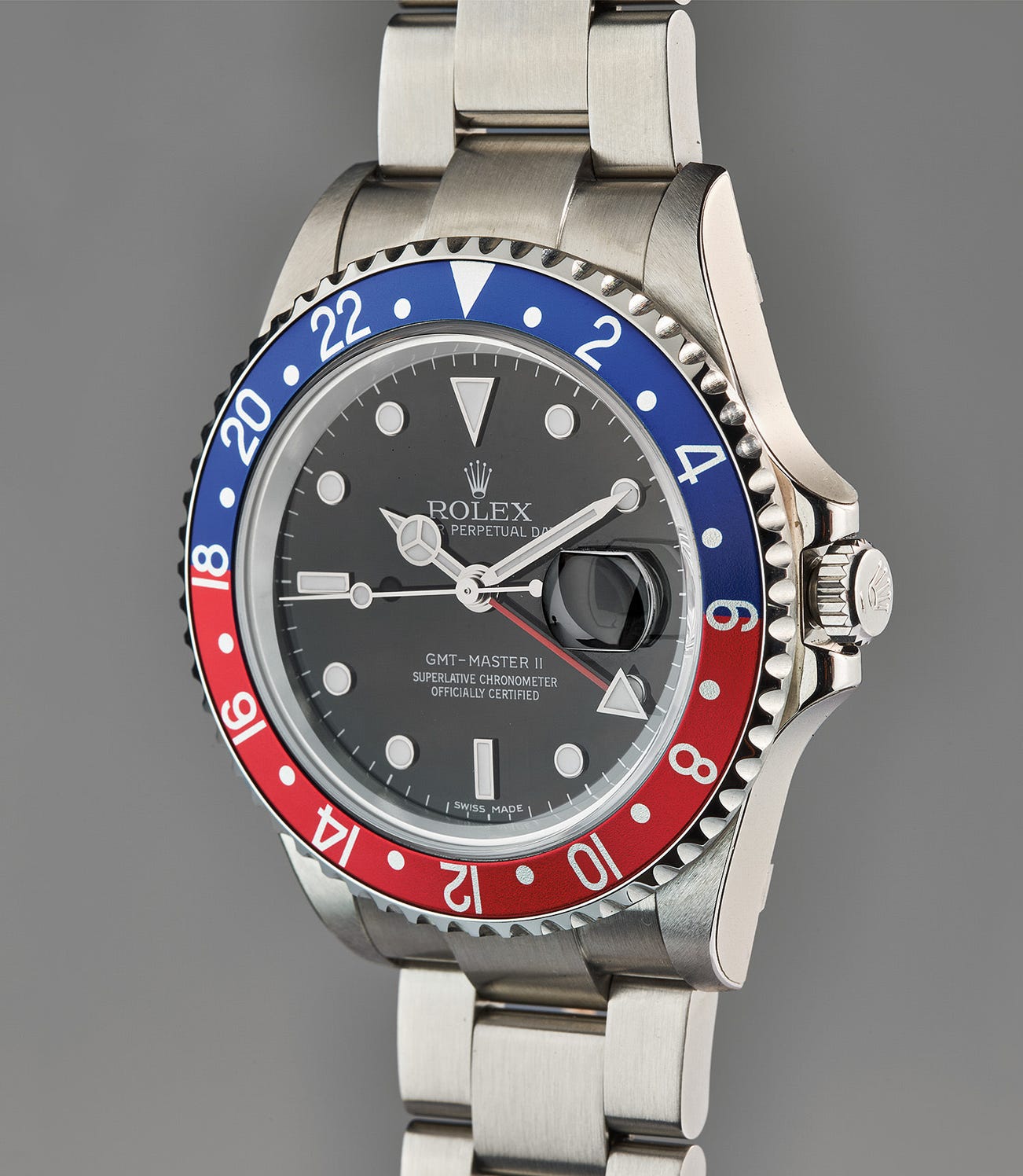 The present reference 16710 is one of the rarest of all GMT-Master II models due to several elements. A transitional model that preceded the use of ceramic bezels for the GMT Master II line, it’s fitted with what’s known as an “error dial”, or “stick” dial, and at the same time, features an upgraded caliber 3186 movement. The nickname “error dial” comes from a slight change in the script signature, with the “II” in the GMT-Master II text at 6 o’clock lacking the top and bottom horizontal lines for the Roman numeral “II” as was most often used. The caliber 3186 was an upgraded caliber with a Parachrom hairspring, and while it was for use in the new model GMT-Master 116710, these calibers were also found on late examples of the 16710 M series.