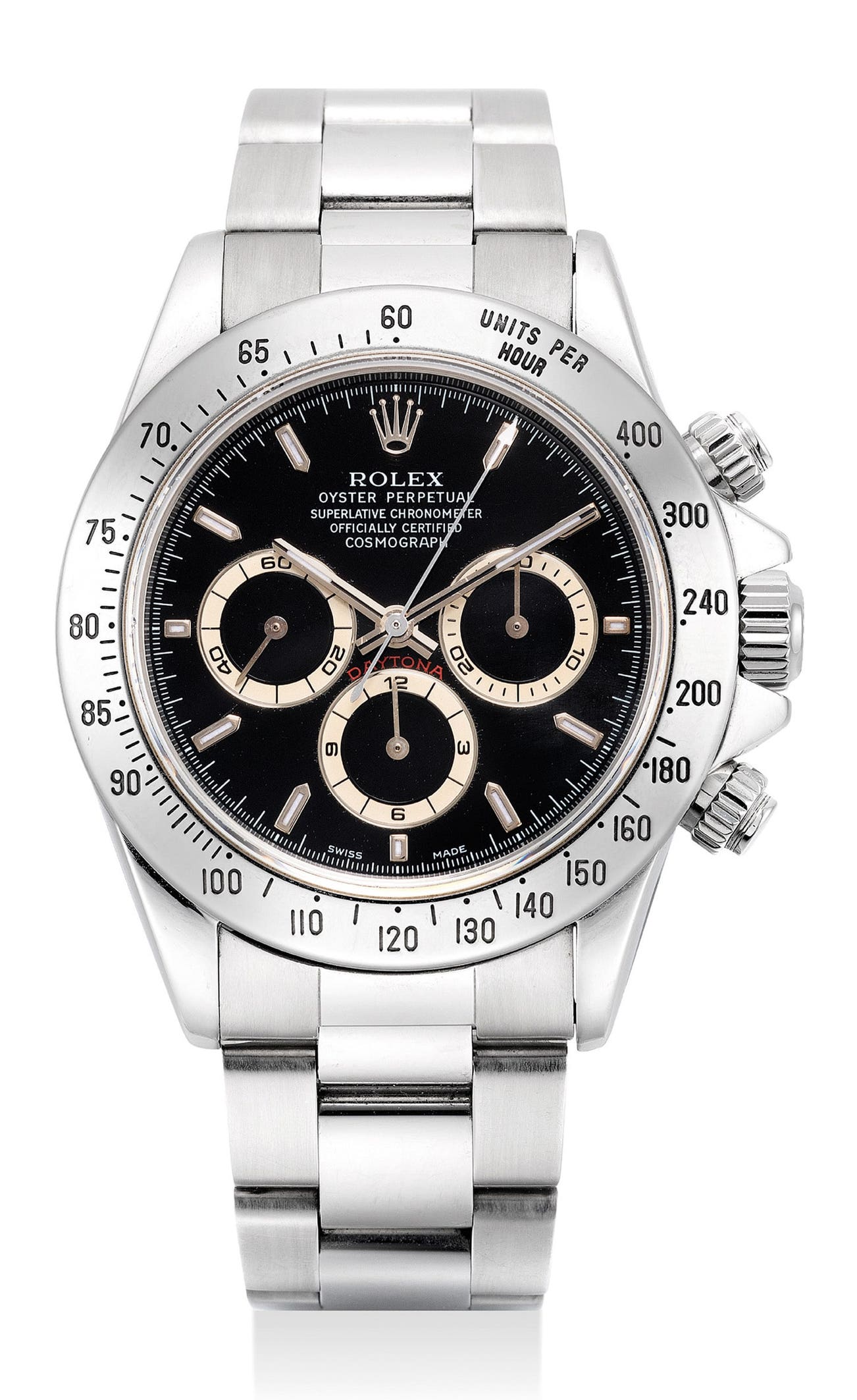 The present example is a Rolex Cosmograph Daytona in stainless steel that features a desirable "tropical" registers developed through age across examples fitted with black dial, the present lot displays a uniformed tropicalization making it highly desirable and sought after by collectors.