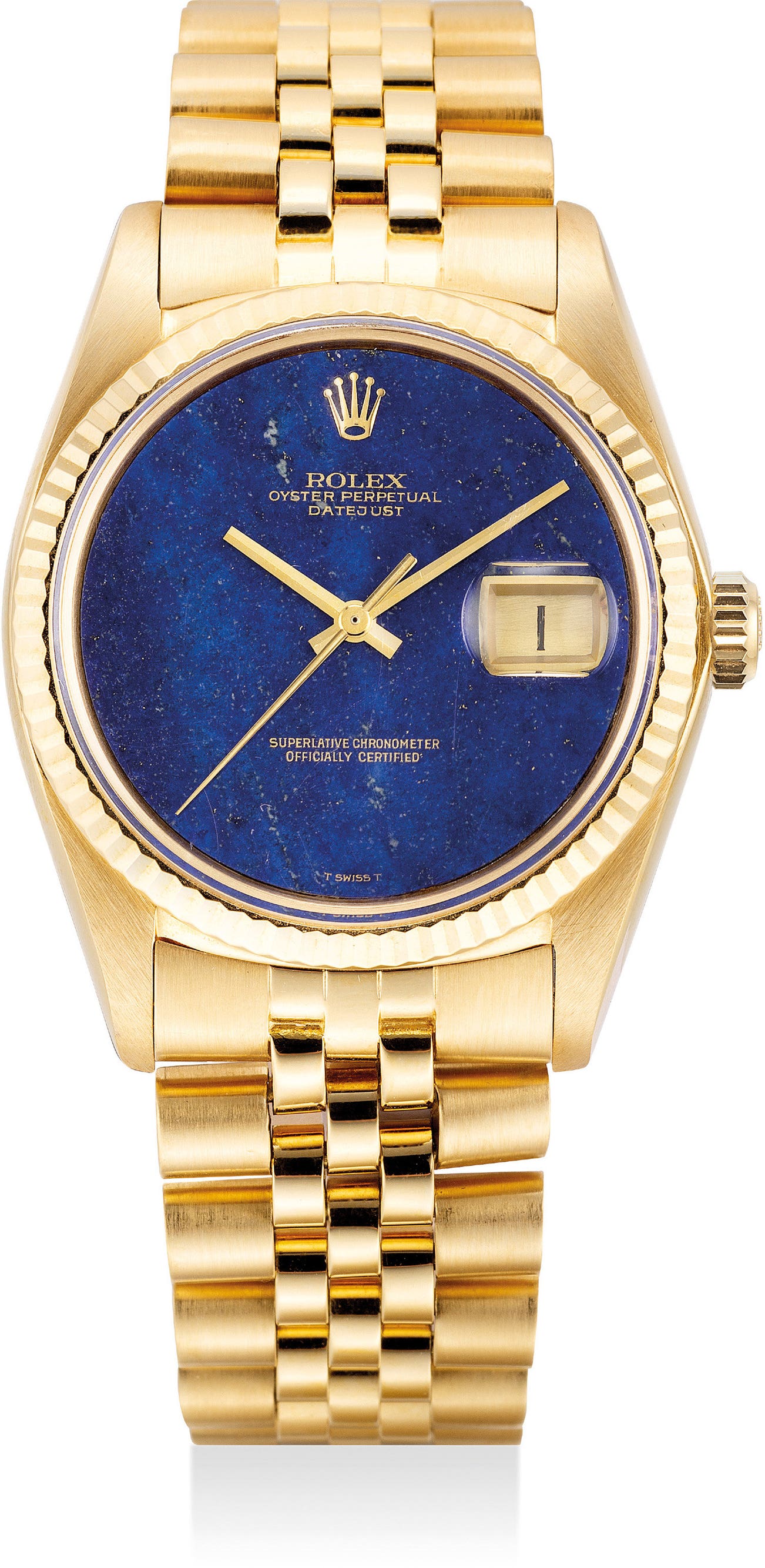 The present Rolex Datejust ref. 1601 is fitted with a Lapis Lazuli dial. Rolex has many examples spread across various models featuring hardstone dials from many different natural materials found from all around the world. The combination of the blue and gold reflects the word “luxury” synonymously with the color combination and lapis lazuli itself being a prized and treasured material during the ancient Egyptian times.