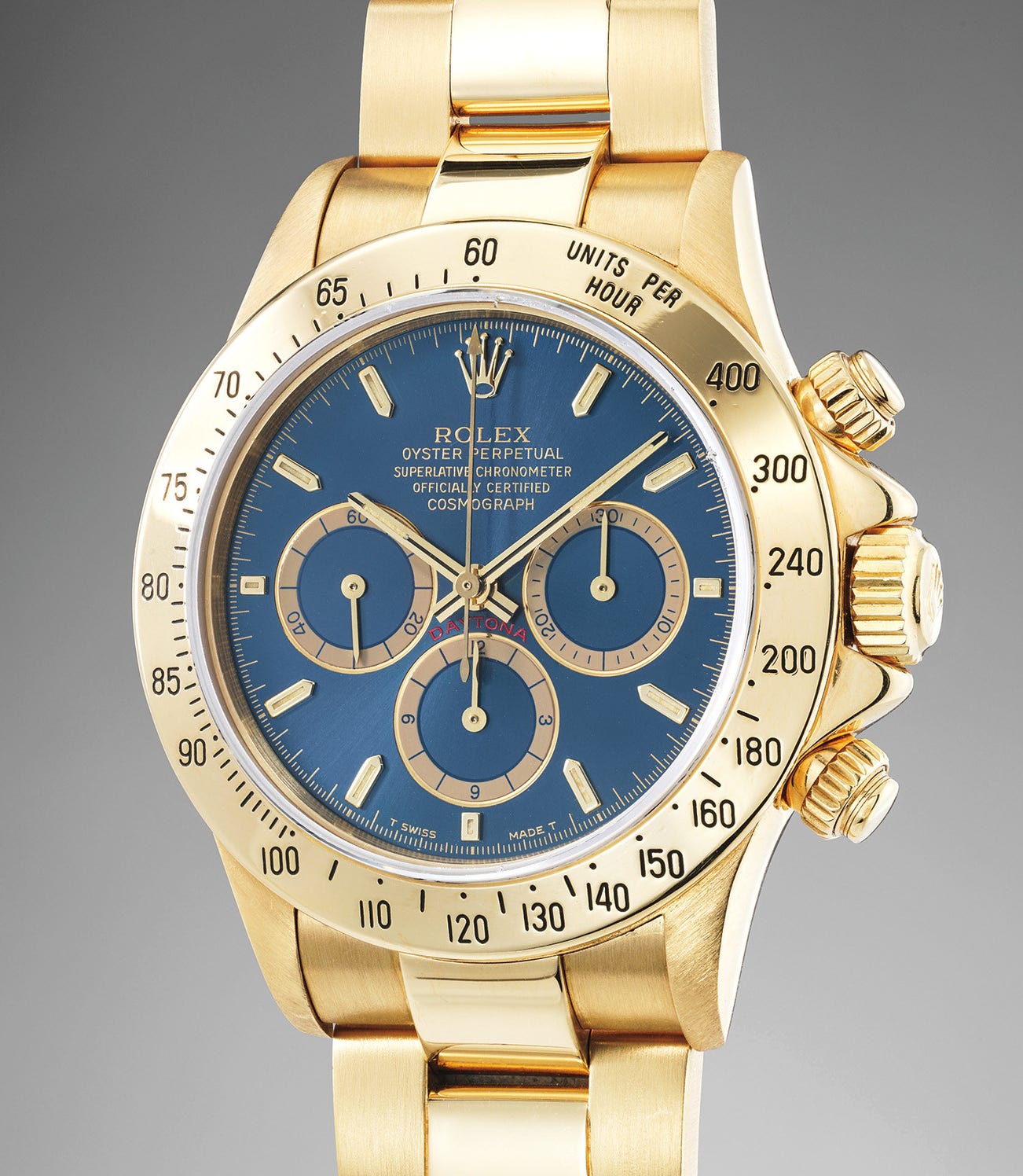 The present reference 16528’s striking good looks is the result of a potent formula, consisting of a ritzy yellow gold case in excellent condition and a superb blue dial with a sun ray pattern, making it one of the rarest and most exclusive Daytonas ever created and a crown jewel for the discerning Daytona collector.