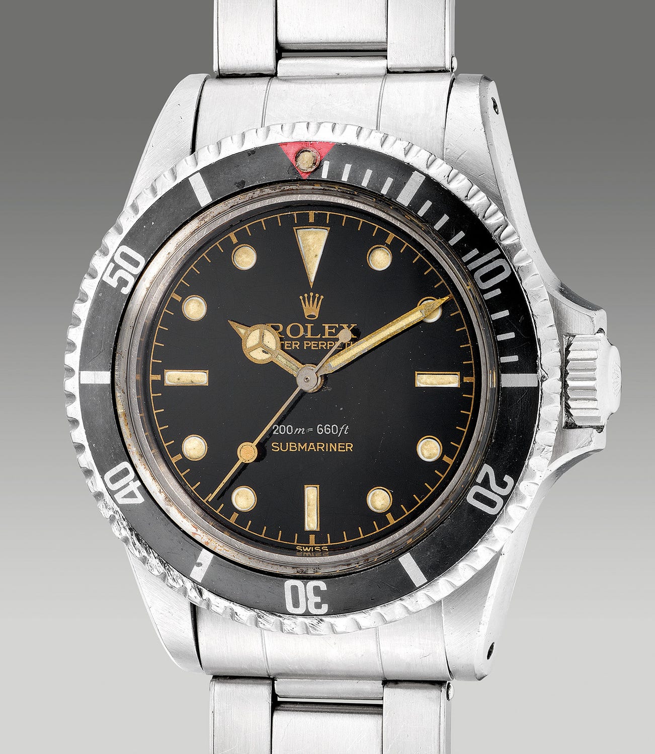 Early examples of the reference were fitted with “glossy” black lacquered dials with various iterations with minor adjustments in details before it was transitioned to “matte” dials in approximately 1966. With a design that is extremely similar to its counterpart ref. 5513, the ref. 5512 is certainly rarer as it features a chronometer certified caliber 1530, and is today highly sought after by collectors. The earliest dials for the ref. 5512 (referred as Mark I dials) are in close resemblance to its predecessor ref. 6538 with an “Old Font” coronet identifiable via the last “spike” on the far right extending further than others. Two dial variants were available during the period, both featuring a chapter ring, one with two lines of text and the other with four lines of text. However, the earliest examples of the ref. 5512 with square crown guards only featured a dial with two lines of texts with “four-liner” dials only appearing in slightly later examples of the reference featuring “pointed” crown guards. Furthermore, the dial features depth rating printed with silver texts above the gilt “SUBMARINER” inscription above 6 O’clock. The bezel insert with a red triangle is a distinct feature for early examples of ref. 5512, commonly featured in its previous references with the absence of crown guards.