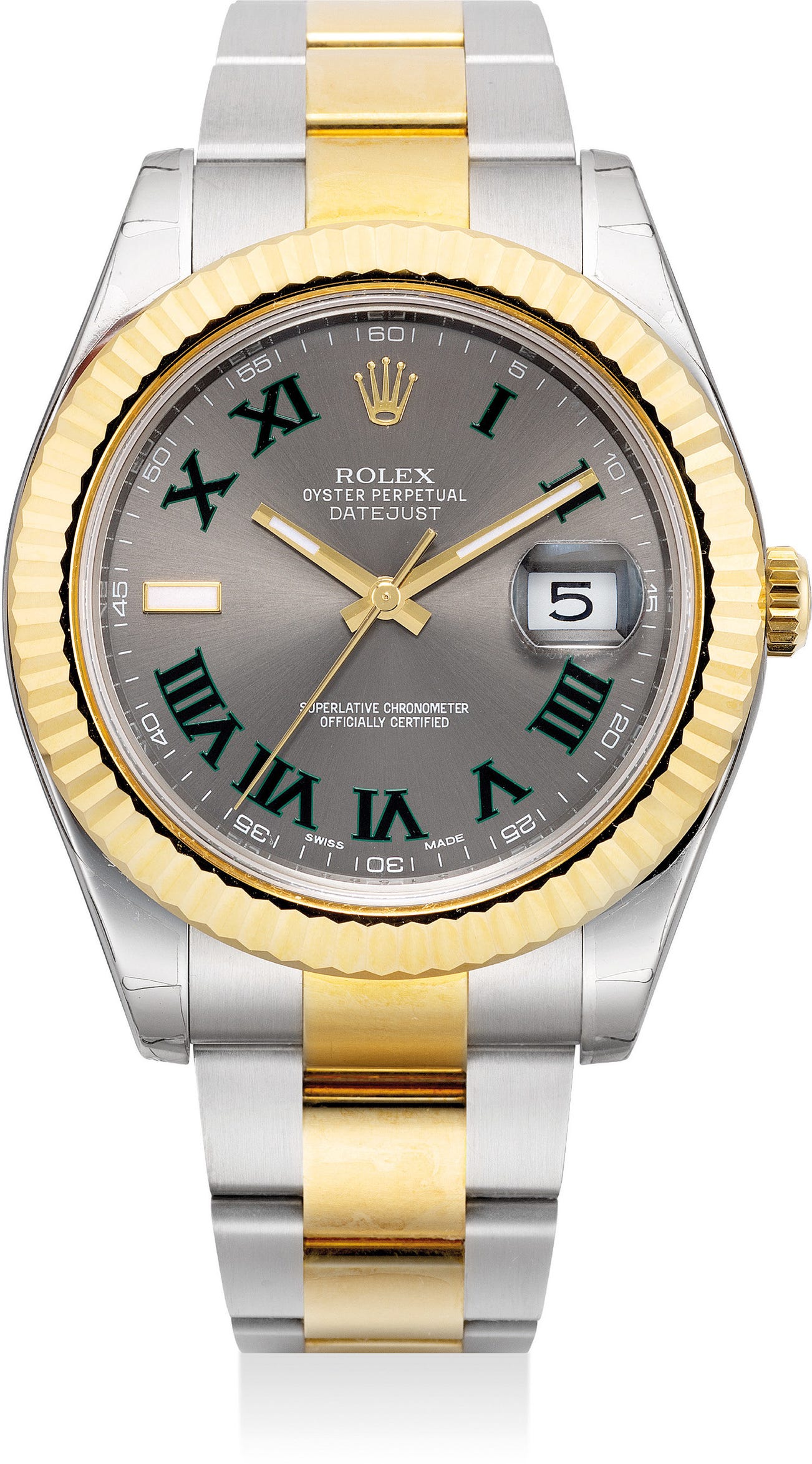 A large yellow gold and stainless steel wristwatch with center seconds, date, bracelet, guarantee and box