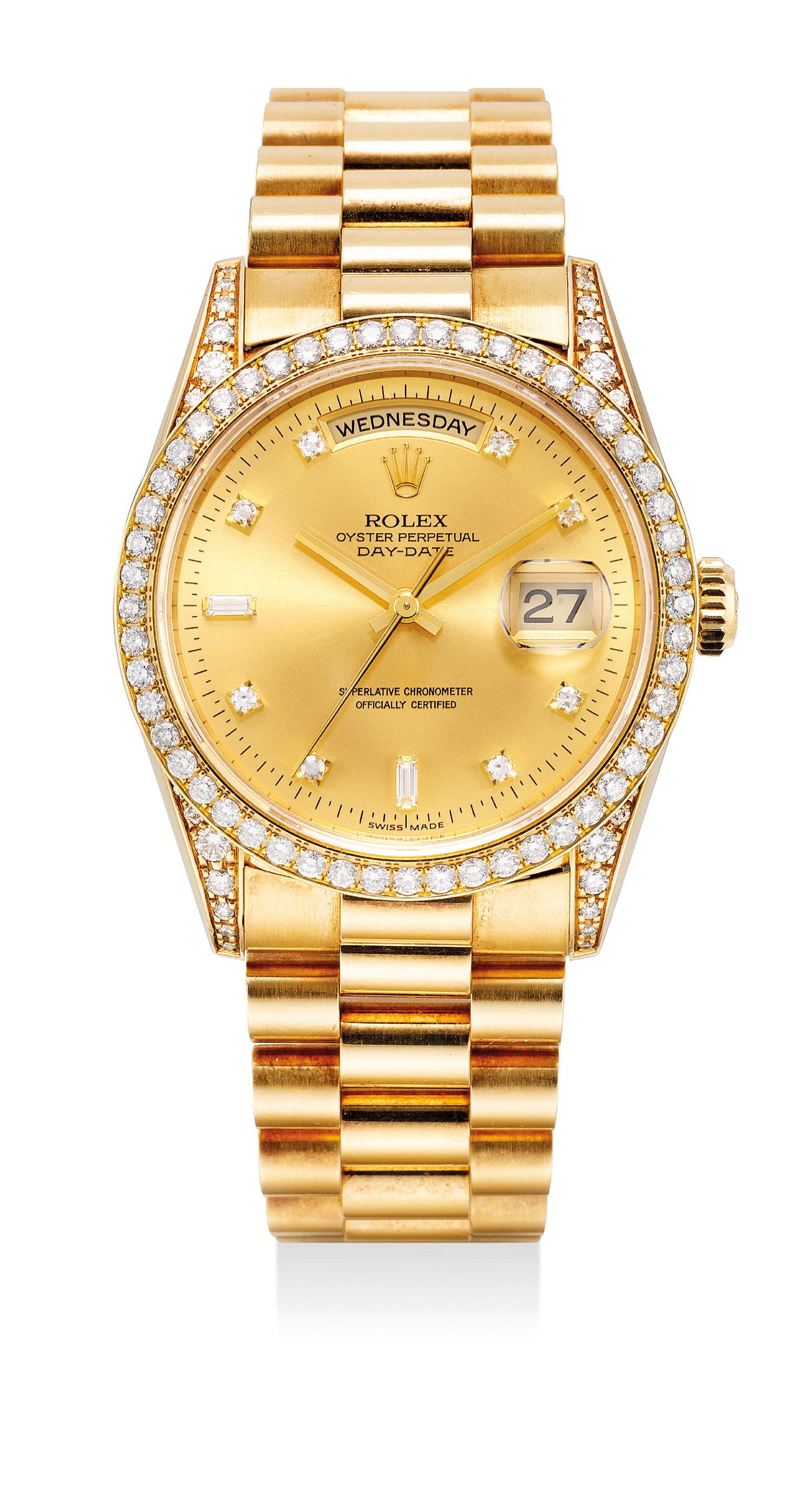 A very fine and attractive yellow gold and diamond-set wristwatch with sweep center seconds, date, bracelet, guarantee and presentation box