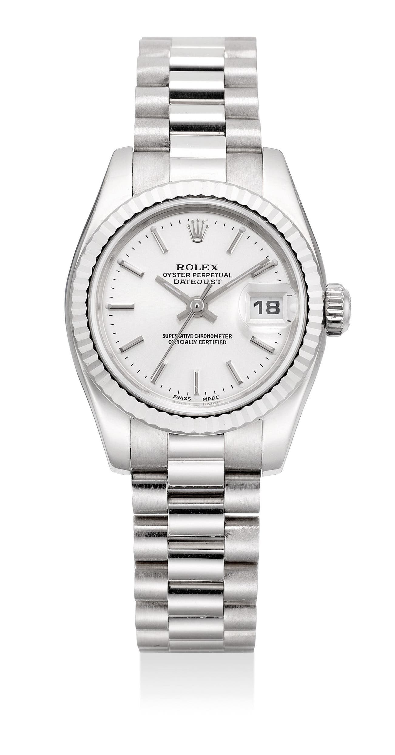 A lady’s fine white gold wristwatch with sweep center seconds, date and bracelet
