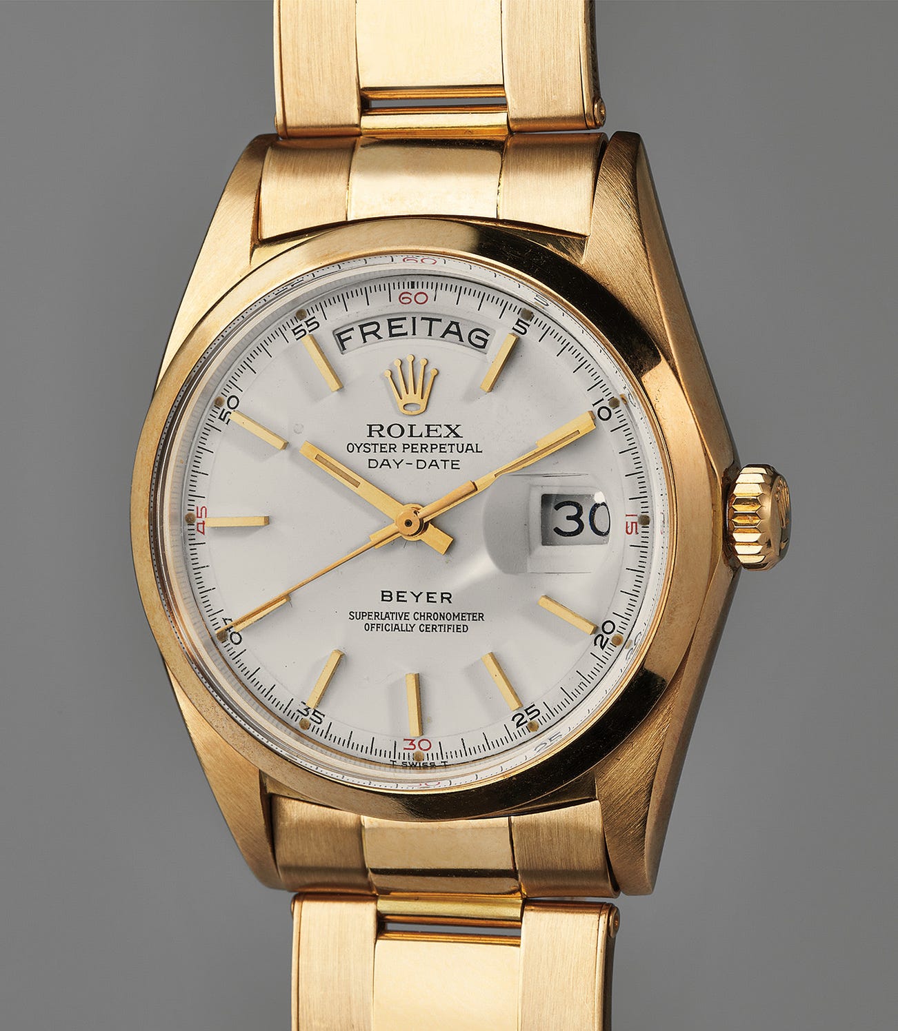 The present reference 1802 is an exceptional example, immortalized in Pucci Papaleo’s tome, The Rolex Day- Date. Named “Sechseläuten”, it’s a noteworthy example with its rarely seen Beyer-signed dial and German calendar. Making it even more distinctive, it’s fitted on its original Oyster-style bracelet with correct endlinks – a rare option adding to its desirability. Upon examining its outstanding state of preservation, it becomes obvious why this ref. 1802 was chosen by Pucci Papaleo as one of the most beautiful Day-Dates known. In lovely original condition, the watch remains unpolished with strong proportions, and crisp lug bevels. The combination of all these elements results in a strikingly wonderful Day- Date wristwatch for the collector.