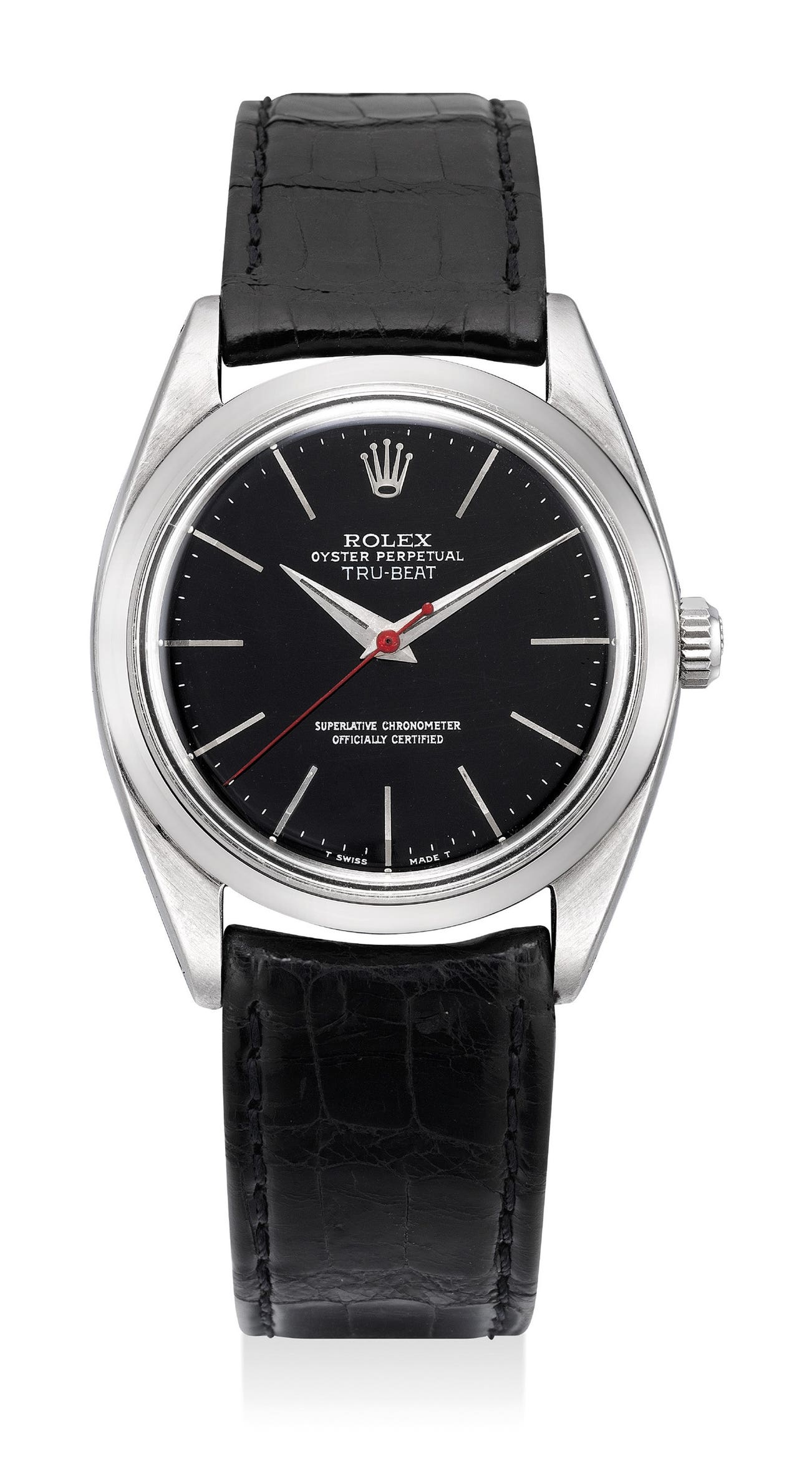 The present example is an attractive example of a Rolex Tru-Beat ref. 6558 in stainless steel fitted with an extremely attractive “glossy” black lacquered dial. Furthermore, it is fitted with the correct caliber 1040. Presented in attractive overall condition, the present example with a rarely seen dial featuring red seconds hand is desirable.