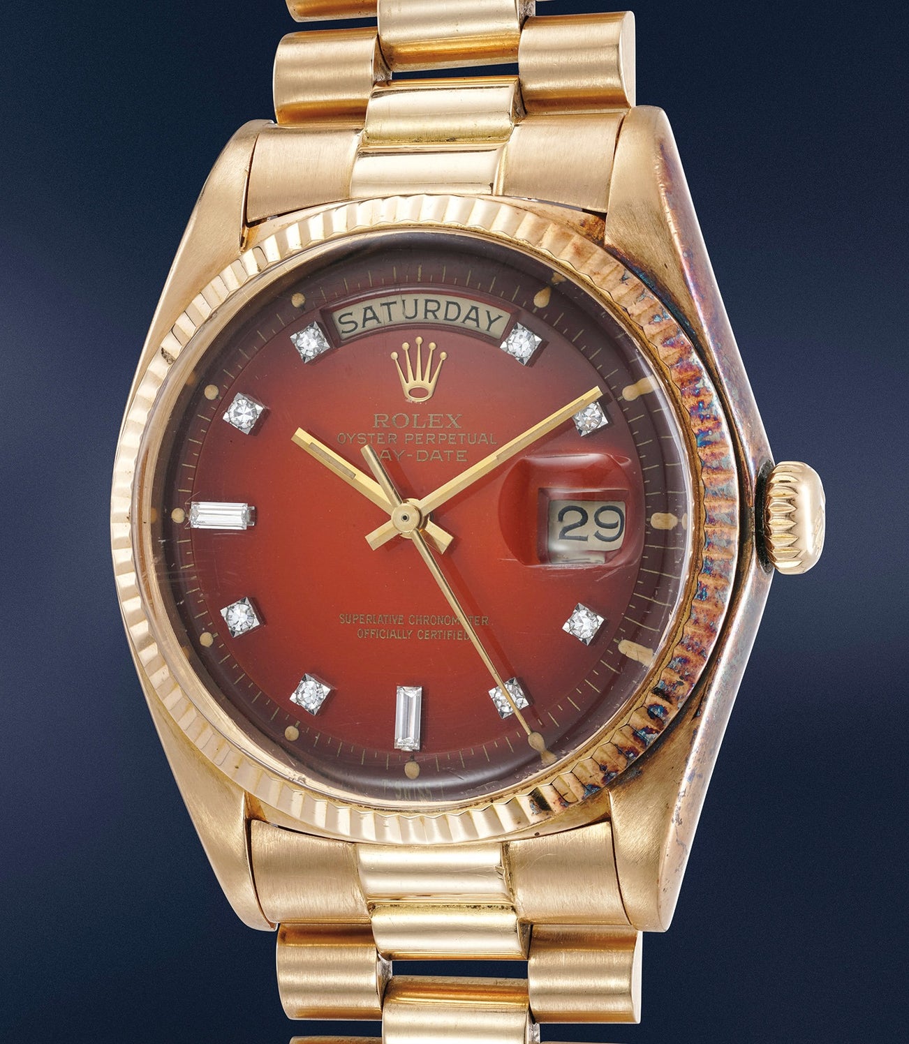 The present watch is dubbed "Manhattan Sunset" due to its burnt orange dégradé dial. Forever preserved in literature, it is prominently illustrated in "Day-Date, The Presidential Rolex" by Pucci Papaleo Editore. It is preserved in excellent condition, shimmering in a way that only Rolex lacquer dials can. Furthermore, all the luminous remain intact and round, attesting to its untouched state of preservation.