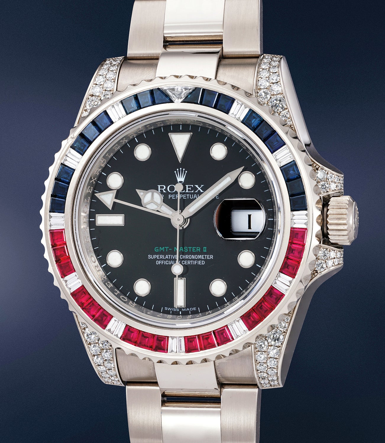 A spectacular and very rare white gold and gem-set dual-time automatic wristwatch with center second, date, bracelet, Guarantee and box