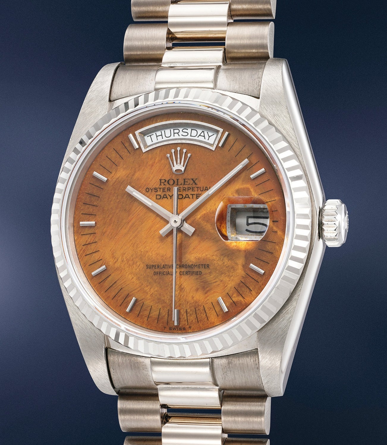 This wonderfully preserved Day-Date features a beautiful briar root wood dial. Given that the wood is a naturally occurring specimen, no two wood dials are exactly the same in appearance. Furthermore, it is particularly rare to find an example cased in white gold displaying a white gold coronet and markers, as most Day-Dates are available in yellow gold.