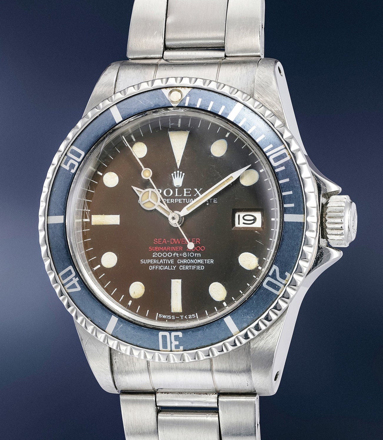 This impressive Sea-Dweller is fitted with a Mk2 dial, which has turned a beautiful and even tobacco tone over time. Correct for a 1.7 million serial number, Mk2 dials are distinguished by the small base of the coronet. It is remarkable how even and rich the brown tone is.