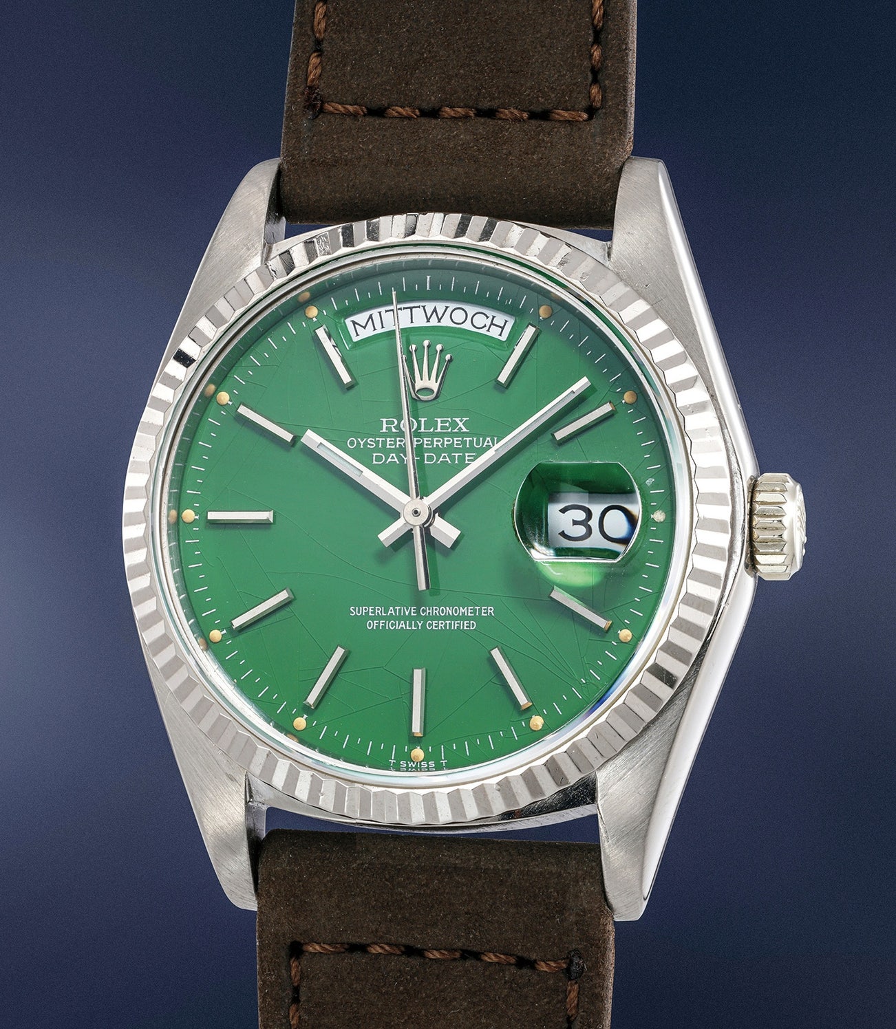 This extremely striking white gold Day-Date displays a beautiful forest green "Stella" dial which showcases a stunning spider-web effect. Such a lush and rich green color is incredibly rare and attractive. Coupled with the white gold case, the effect is stunning. The case itself is preserved in excellent condition with sharp hallmarks beneath the lugs. The top of the lugs displays a crisp and sharp finish.