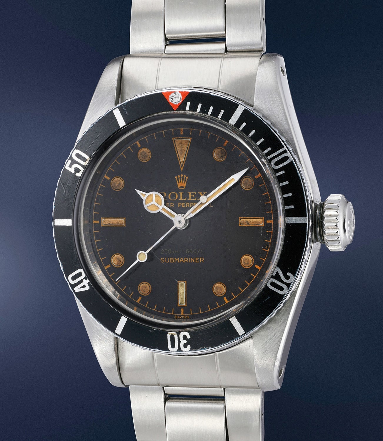 This example, manufactured in approximately 1958, boasts an absolutely original dial, completely devoid of any kind of intervention or restoration. The original luminous material has now acquired a strong dark tobacco colour and the glossy finish has aged to a subtle matte effect. The dial presents a characteristic used by Rolex during these years for a very short time, the luminous marker at 6 being notably lighter than the others. This is an inherent feature of the dial rather than a case of different ageing. It is speculated that the lighter marker would work in combination with the triangular index at 12 to allow for an improved and more immediate readability of the time and therefore minimise the chance for error.
