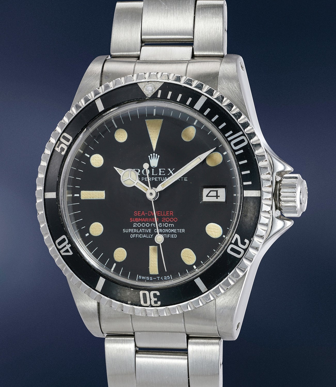 The dial details are characteristic of the Mark II variant of “Double red Sea-Dweller” dials, with a small oval at the base of the coronet and the “D” in “Dweller” aligned with the “I” in “Submariner”.
