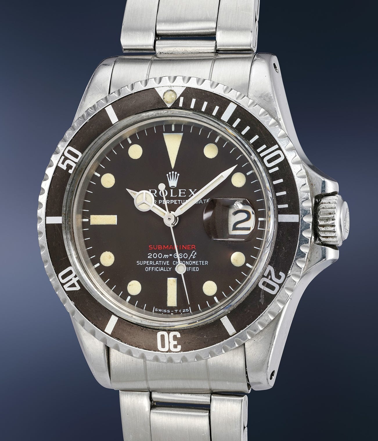 The present "Red Sub" is made even more collectible and attractive by its dark chocolate dial, the topical hue absolutely even throughout the entirety of the dial. A further appeal is given by the "complete" nature of this watch which is accompanied by its original punched guarantee, booklets, green document holder and the box featuring to the inside the ultimate 1970s token: a card happily informing the owner that the box can double as cigarette container.