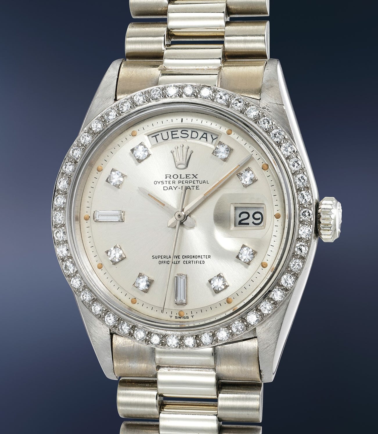 Reference 1804 most notably displays a diamond-set bezel, denoted by the "4" in the reference number. It displays a plexi crystal and is powered by the Day-Date caliber 1555. White gold Day-Dates are much rarer to come by than their yellow gold counterparts, underscoring the rarity of the present timepiece.