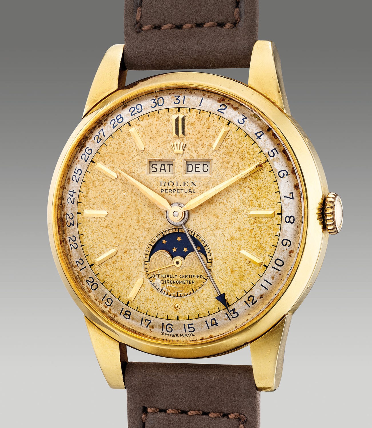 Extremely rare, it is believed that only 350 examples in yellow gold were ever produced. The present example offered in its honest state of preservation is a rare statement to bear. With a heavily patinated two-tone dial, and a crisp case with two hallmarks, the temptation is real.
